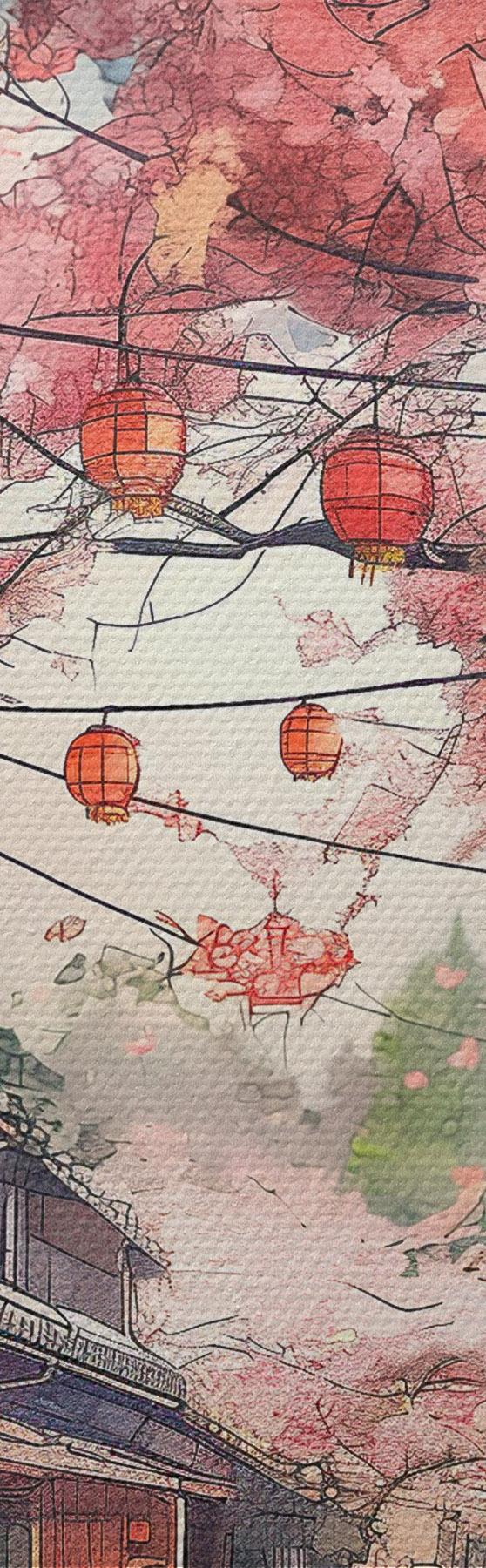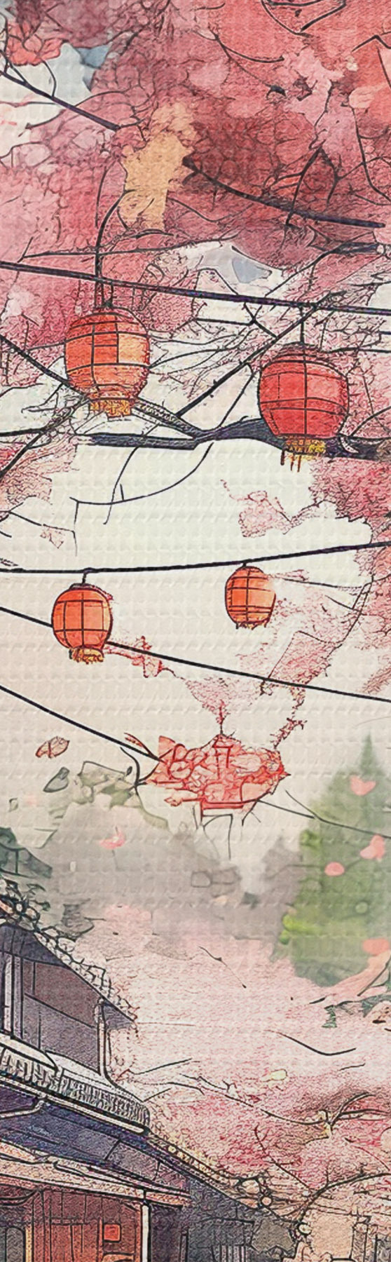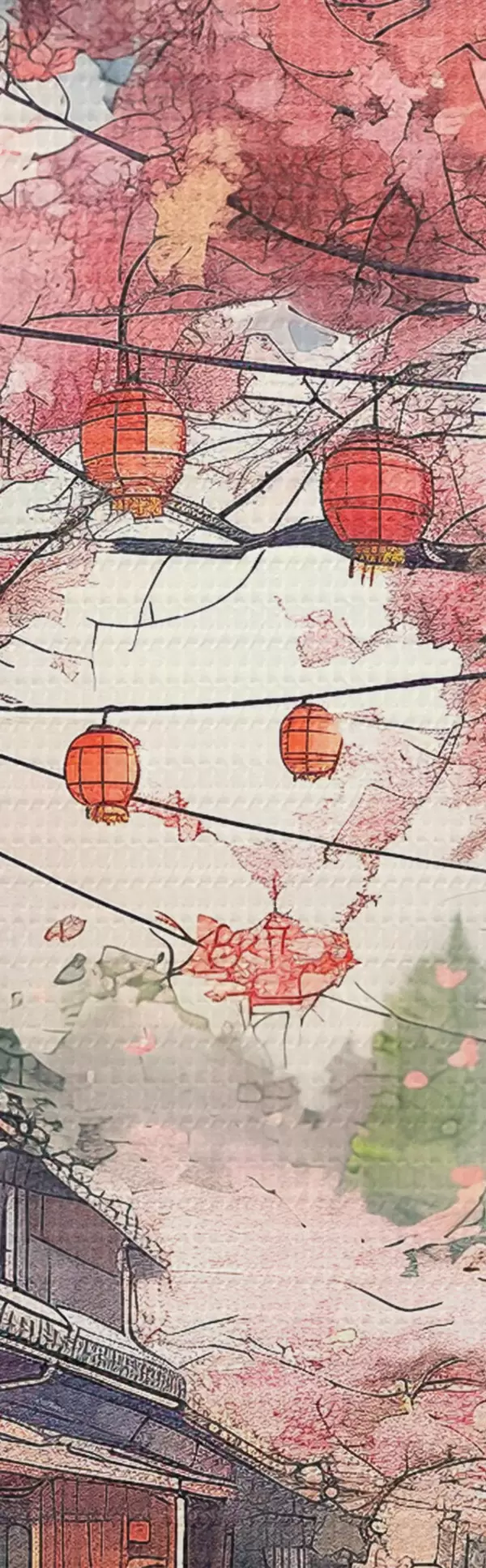 Obrázok Japonská ulica s rozkvitnutými čerešňami, orientálna architektúra, lampáše Nr r39774