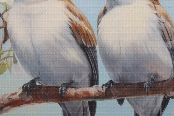 Obrázok Vrabci sediaci na rozkvitnutom konári olejomaľba, modrá, biela, hnedá Nr r39829
