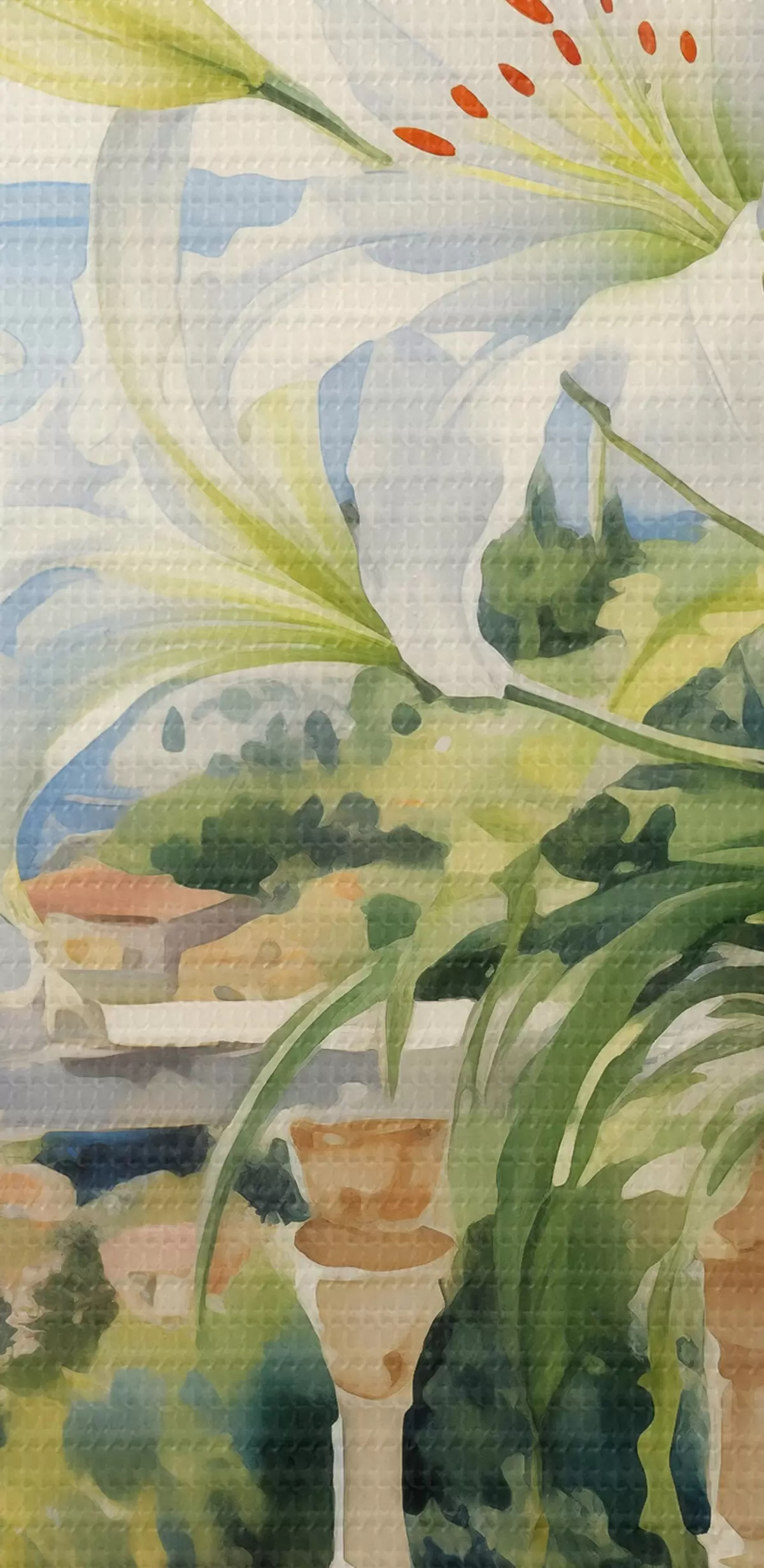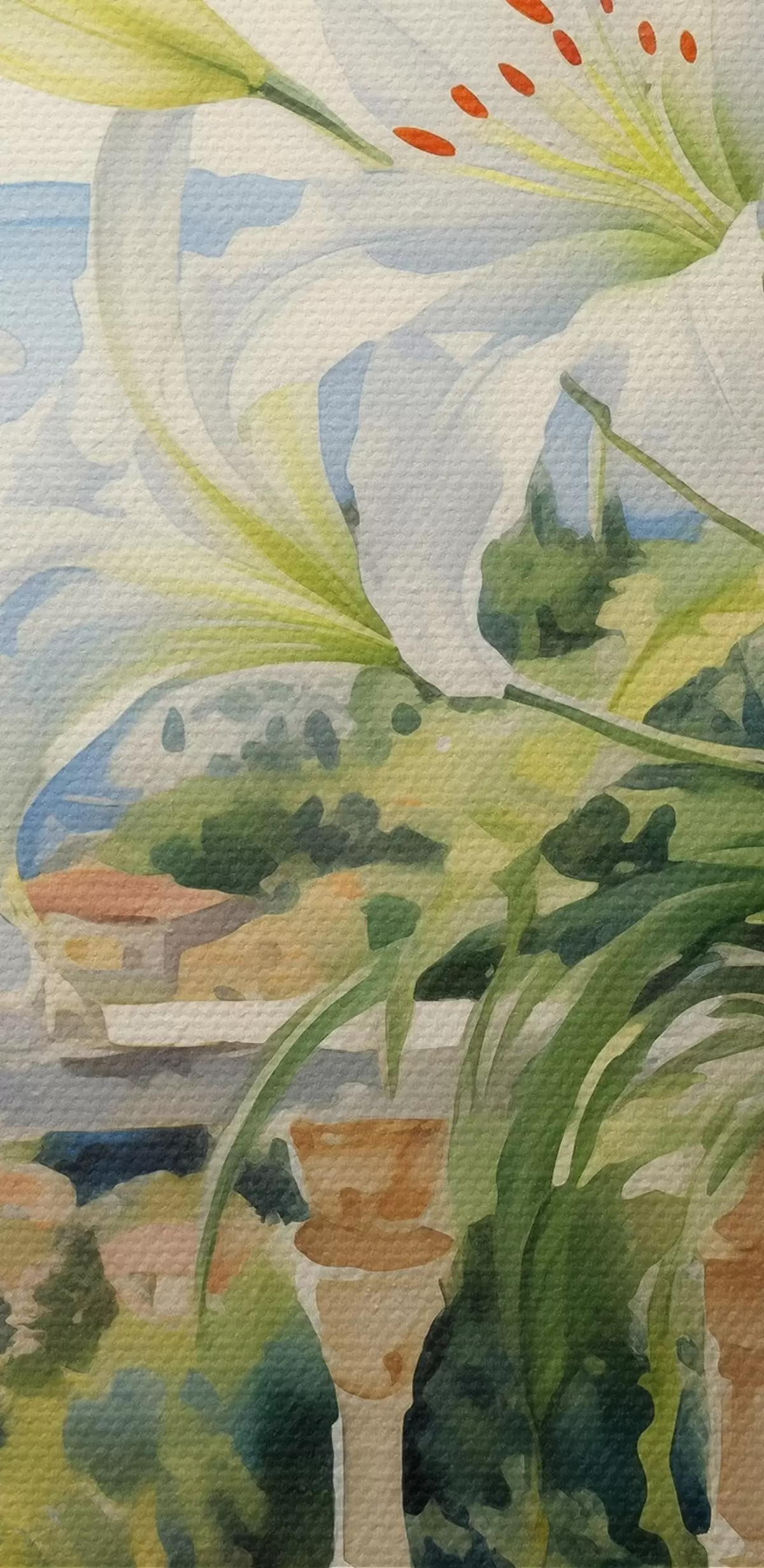 Obrázok Biele ľalie v kvetináči na balkóne na pozadí akvarelu zálivu Nr r39932