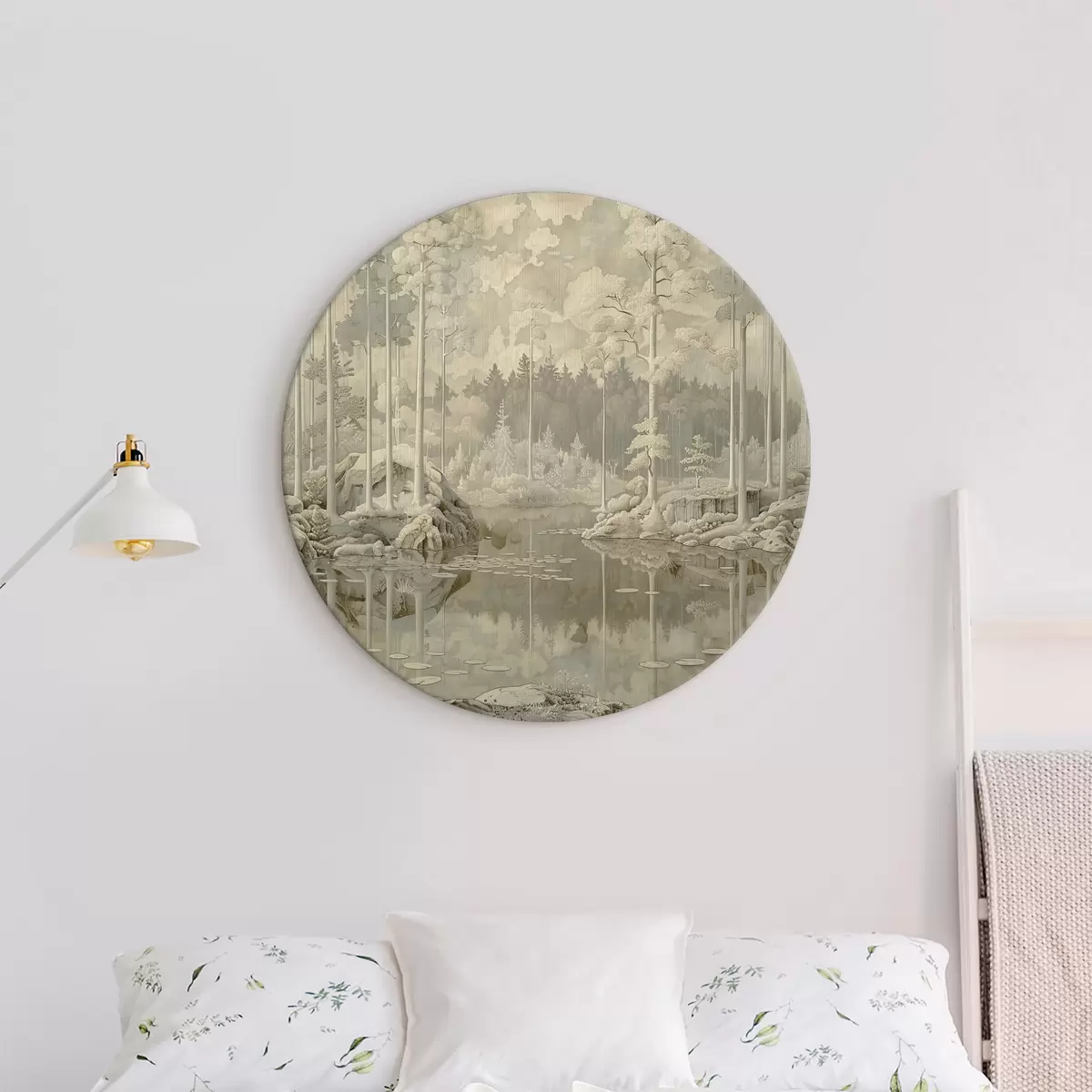 Obrázok Lesná krajina, monochromatické farby, stromy, jazierko, abstrakcia Nr r39975