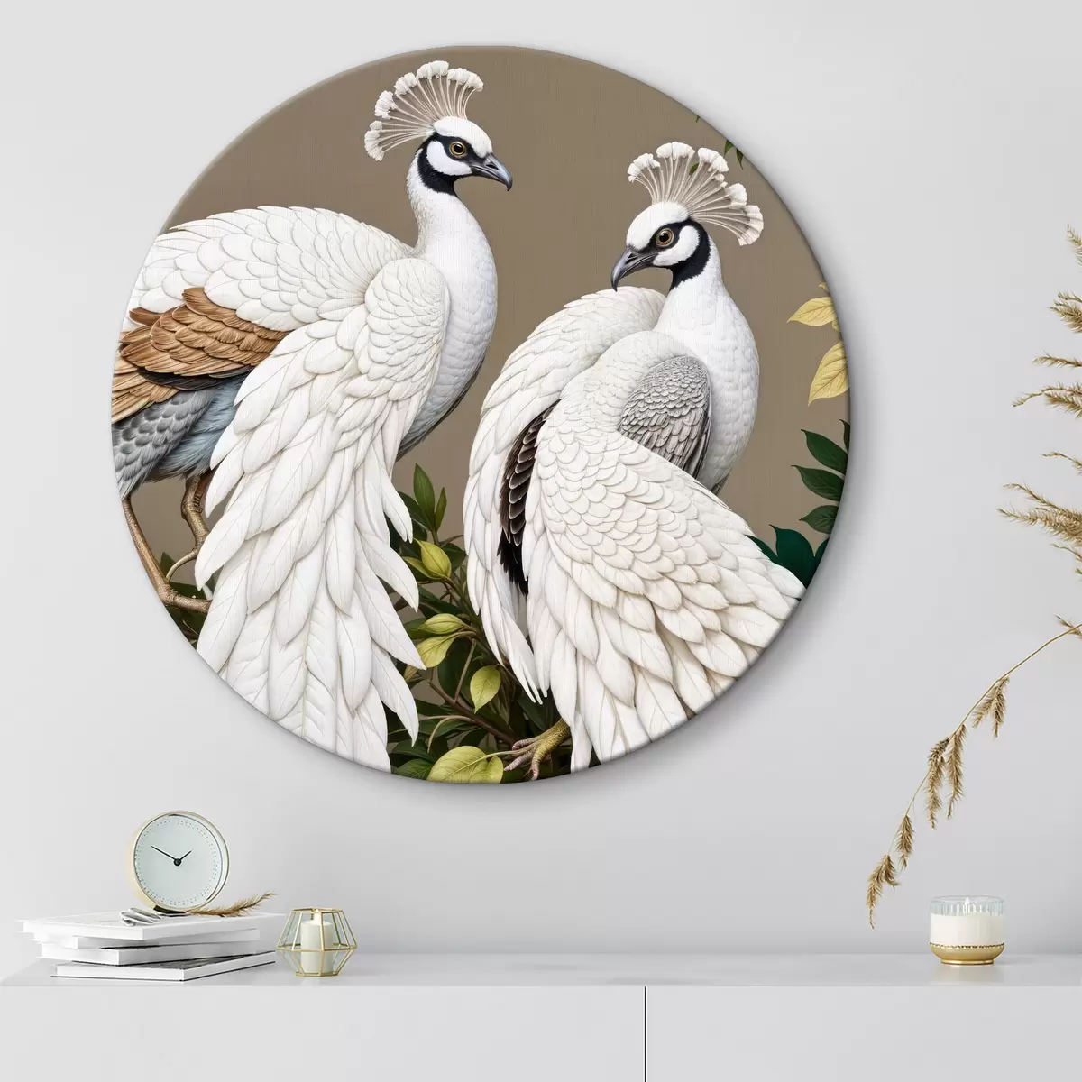 Obrázok Dva biele pávy so zdobeným perím sediace na konári s kvetmi Nr r40022