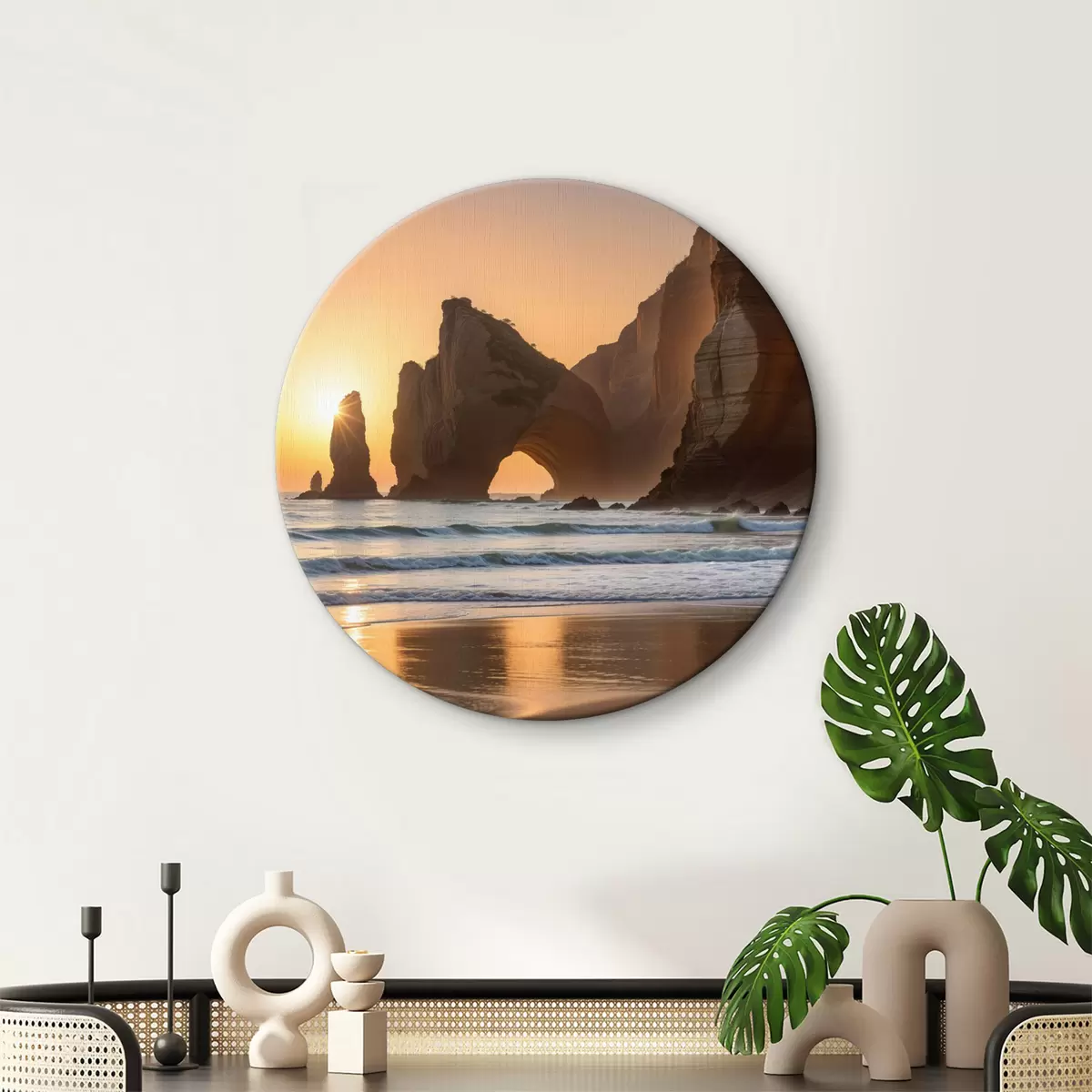 Obrázok Skalnaté pobrežie s hromadami mora a klenbami pri západe slnka s vlnami narážajúcimi na piesočnatú pláž Nr r40025