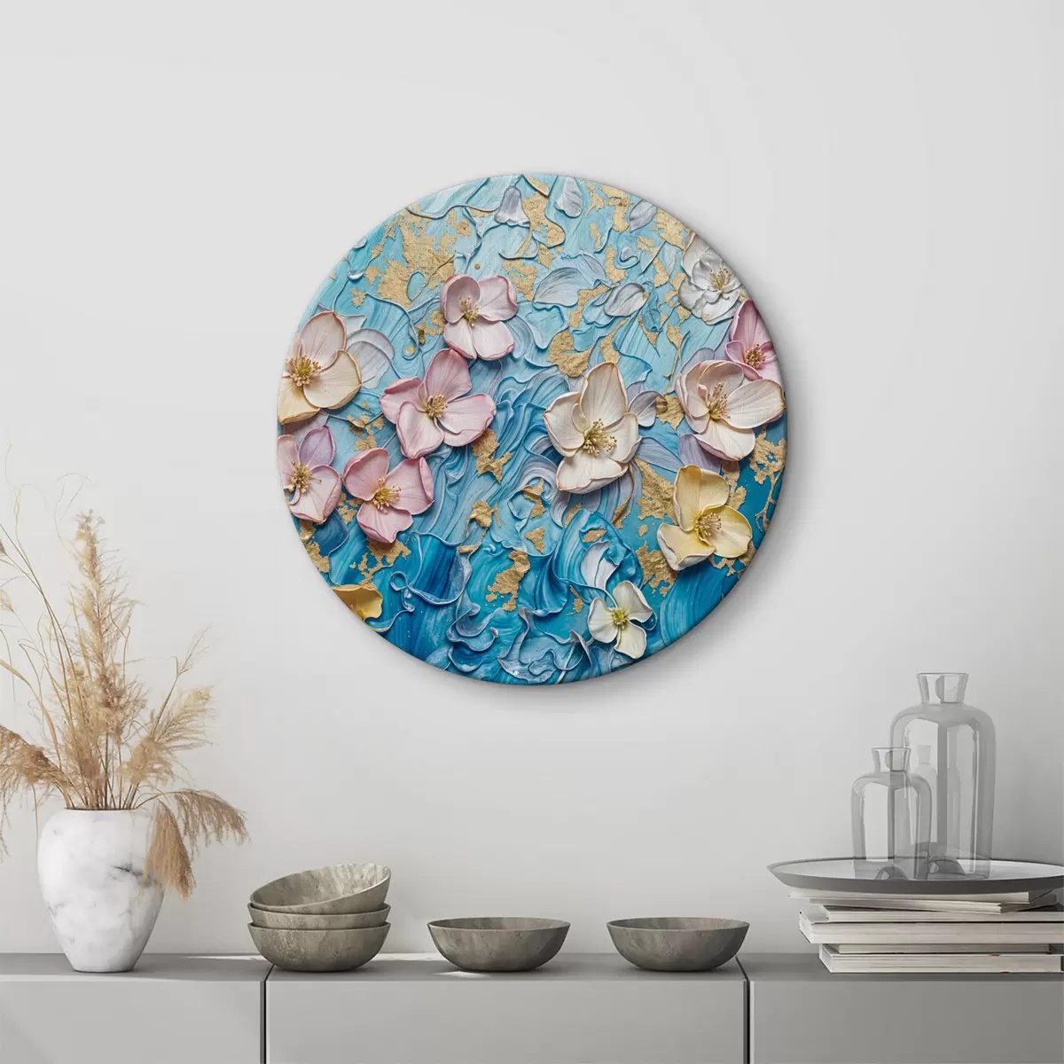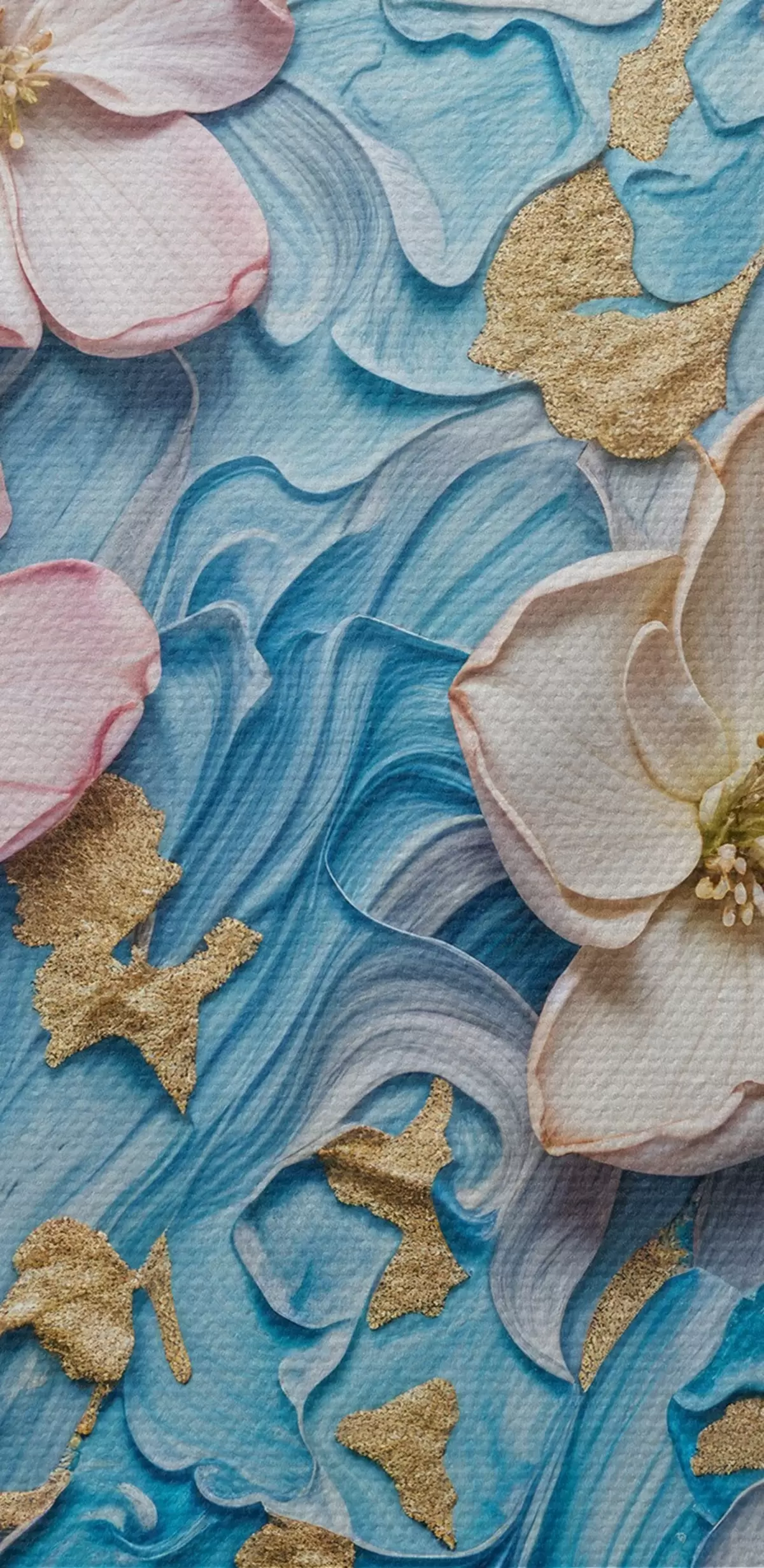 Obrázok Žiarivé kvety s okvetnými lístkami v odtieňoch ružovej, žltej a modrej na textúrovanom abstraktnom pozadí Nr r40034