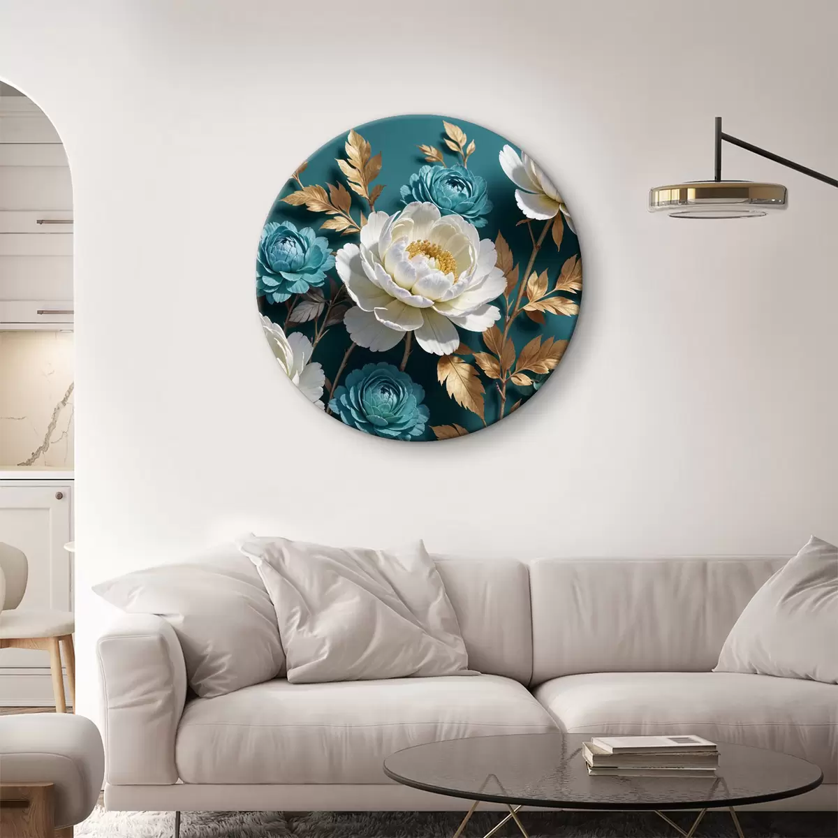 Obrázok Kytica veľkých bielych a modrozelených kvetov pivonky so žltými listami na modrozelenom pozadí Nr r40036