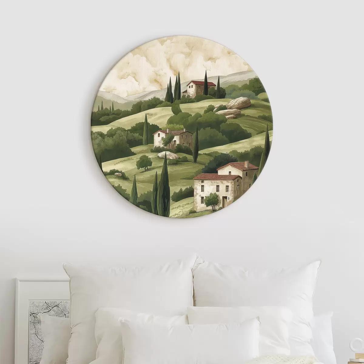 Obrázok Krajina s vintage domčekmi, pastelové zelené farby, akrylová kresba, rustikálna Nr r40080