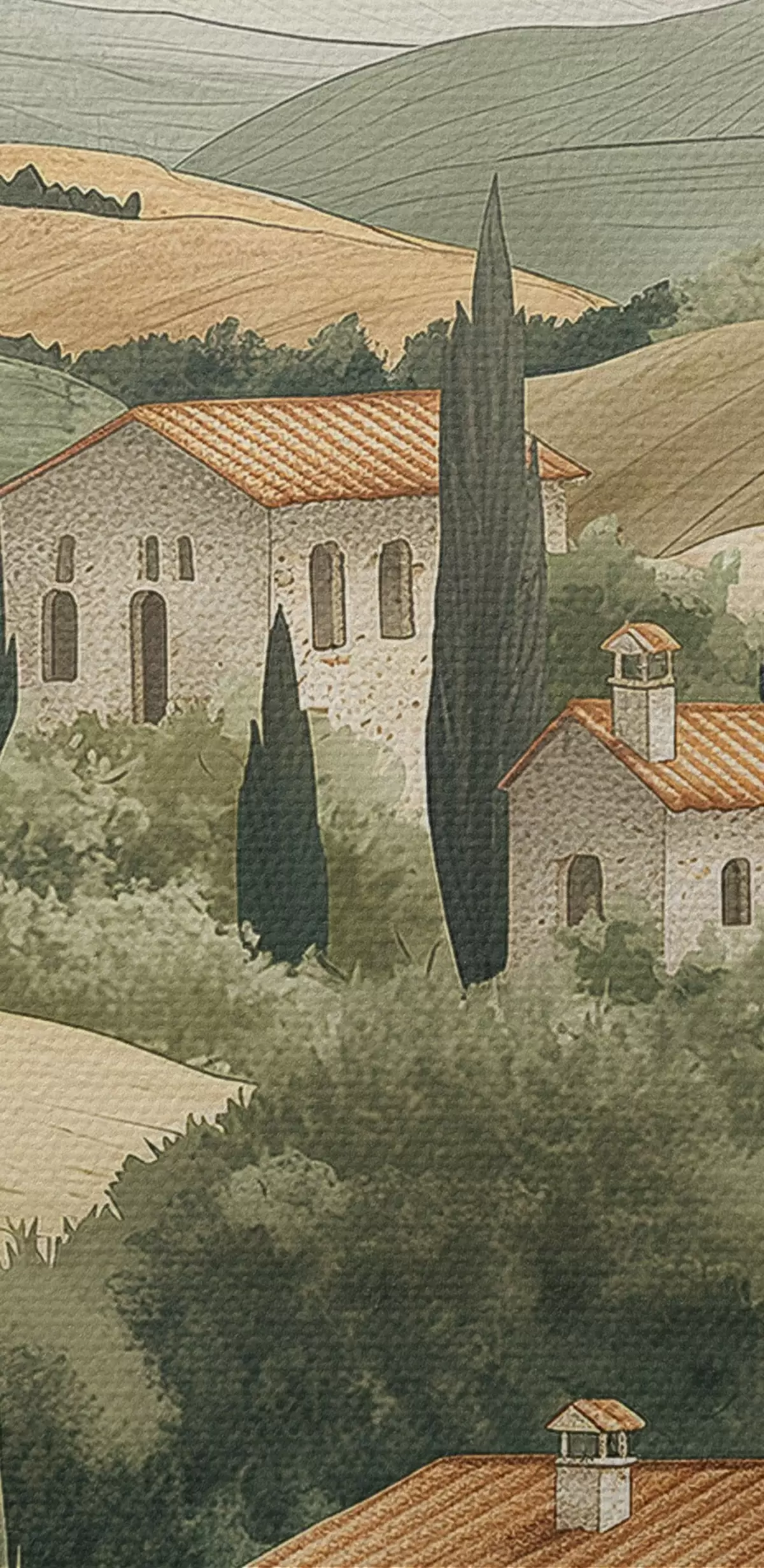 Obrázok Toskánska krajina s vintage domami, pastelovými farbami, kopcami a stromami, rustikálny Nr r40082