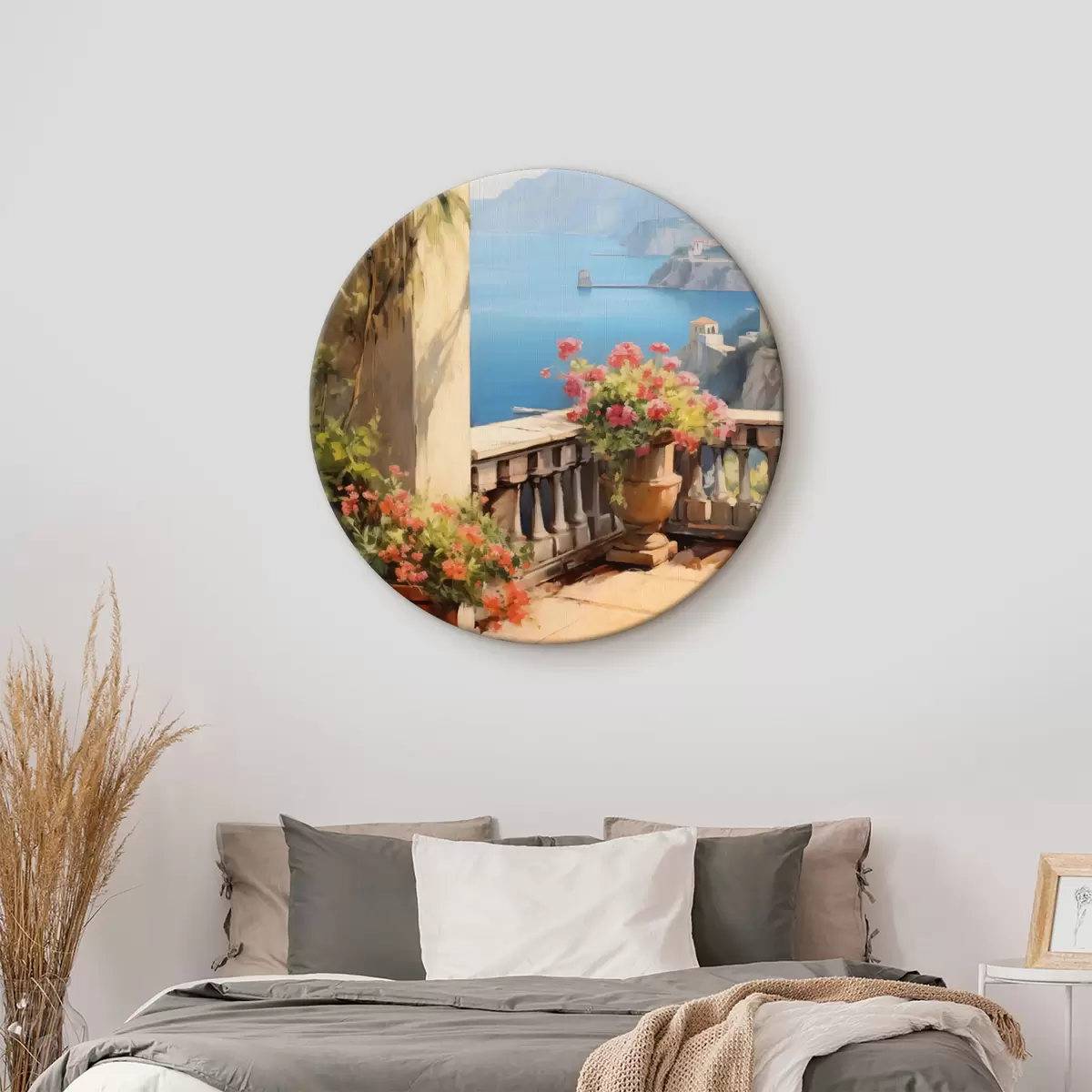 Obrázok Kvetináč s kvetmi na balkóne na pozadí morského zálivu a hôr imitácia olejomaľby Nr r40089