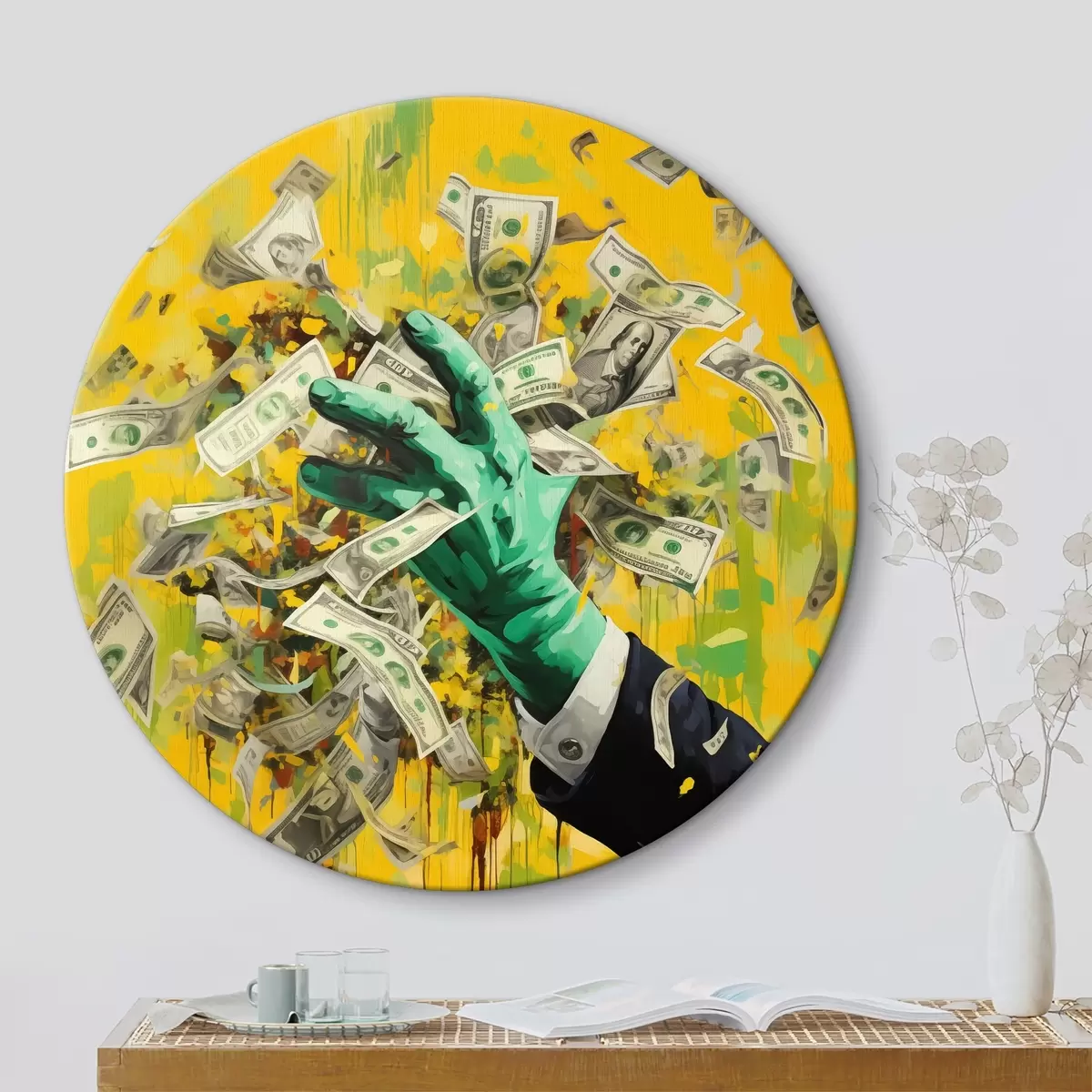 Obrázok Zelená ruka v saku chytí papierové bankovky, peniaze, žlté pozadie, imitáciu olejomaľby Nr r40097