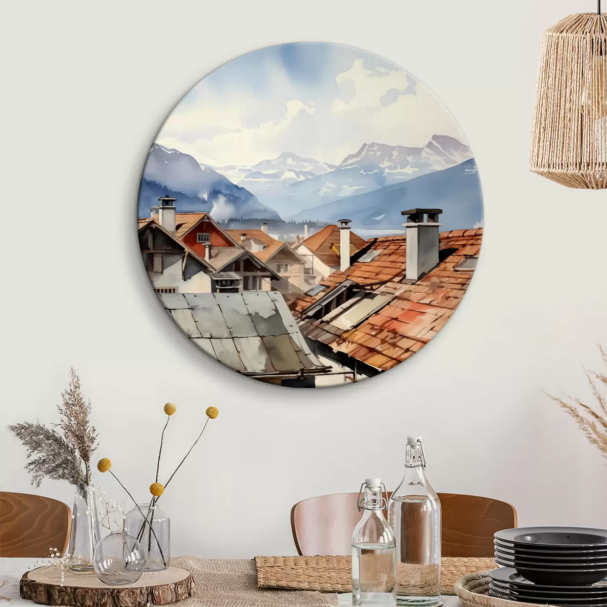 Obrázok Strechy dedinských domov na pozadí hôr akvarel Nr r40107