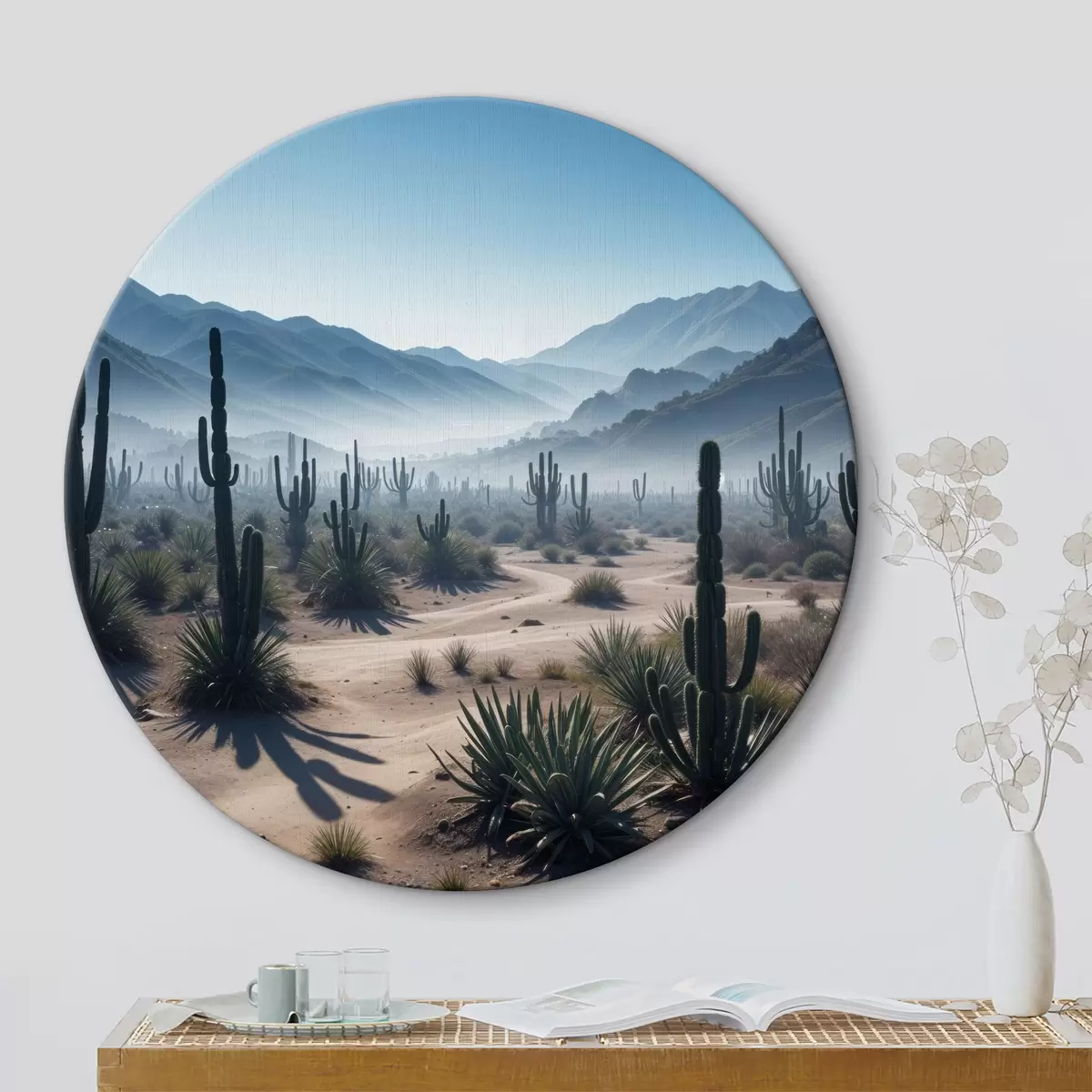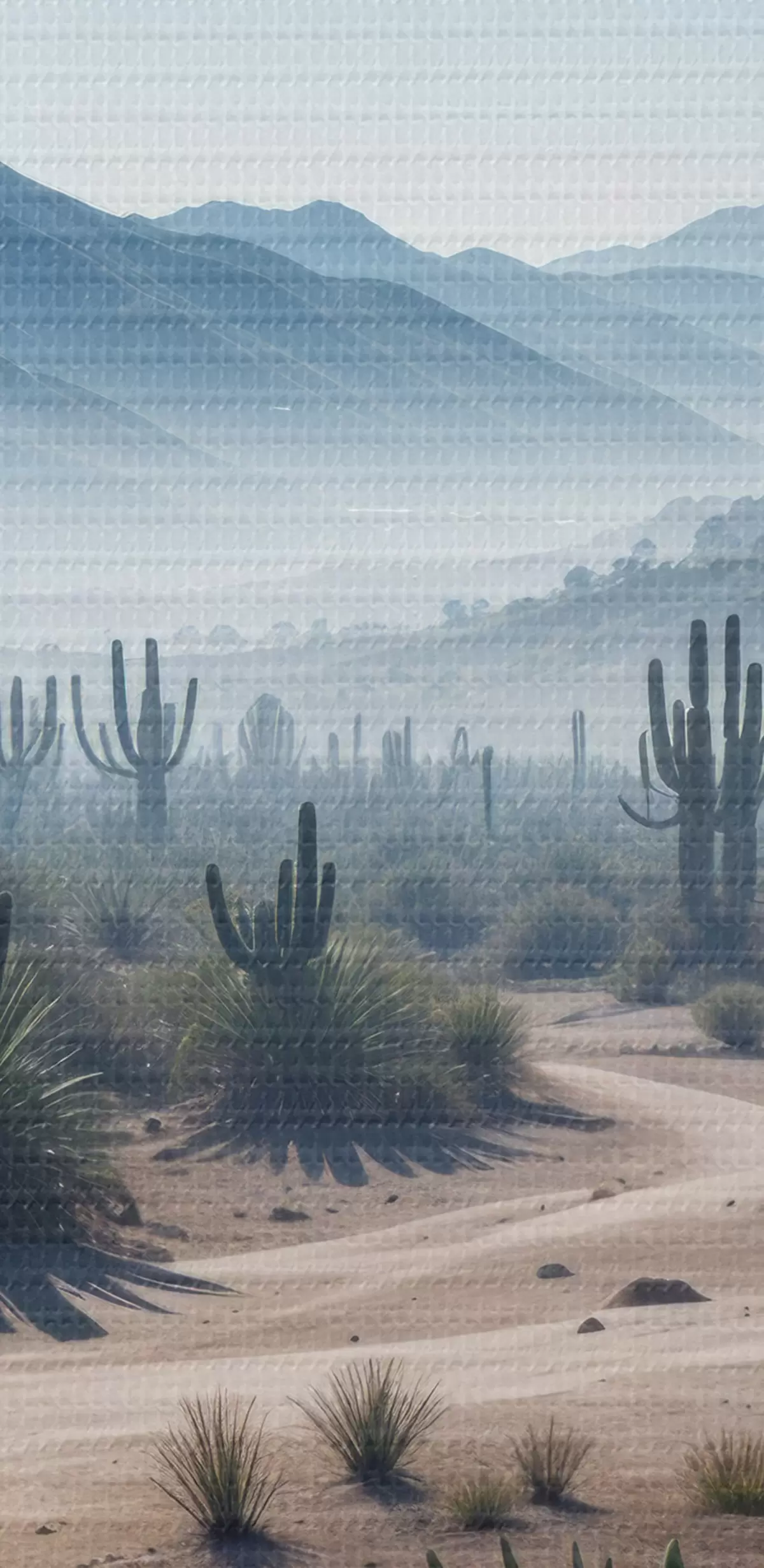 Obrázok Púštna krajina s vysokými kaktusmi a rastlinami juky v popredí, obklopená hmlovými horami Nr r40153