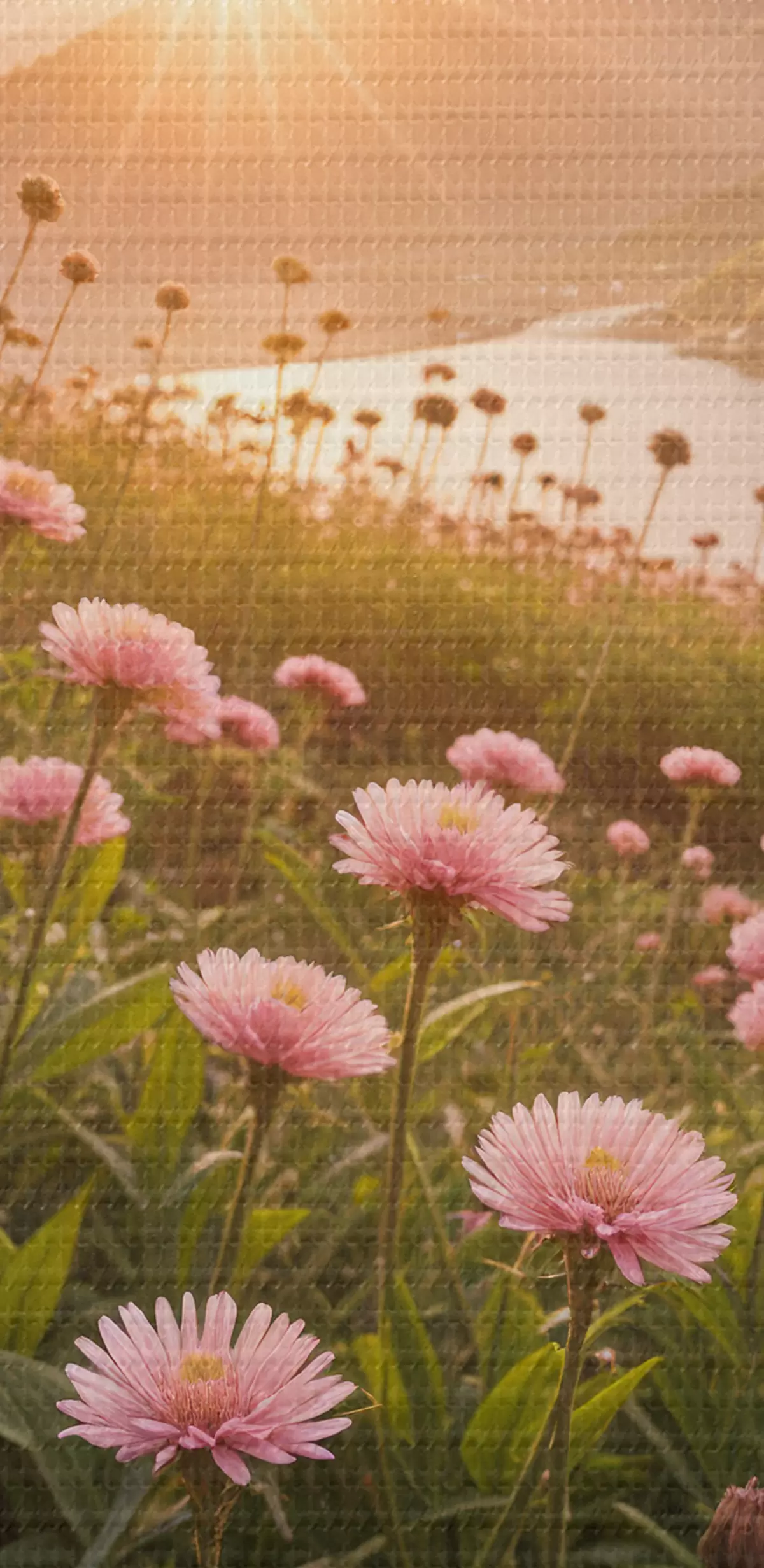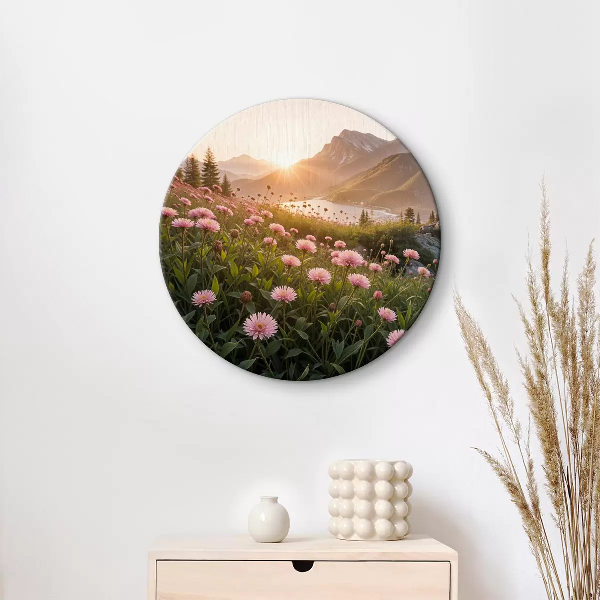 Obrázok Pole s ružovými sedmokráskami v popredí s veľkým pohorím v pozadí Nr r40154