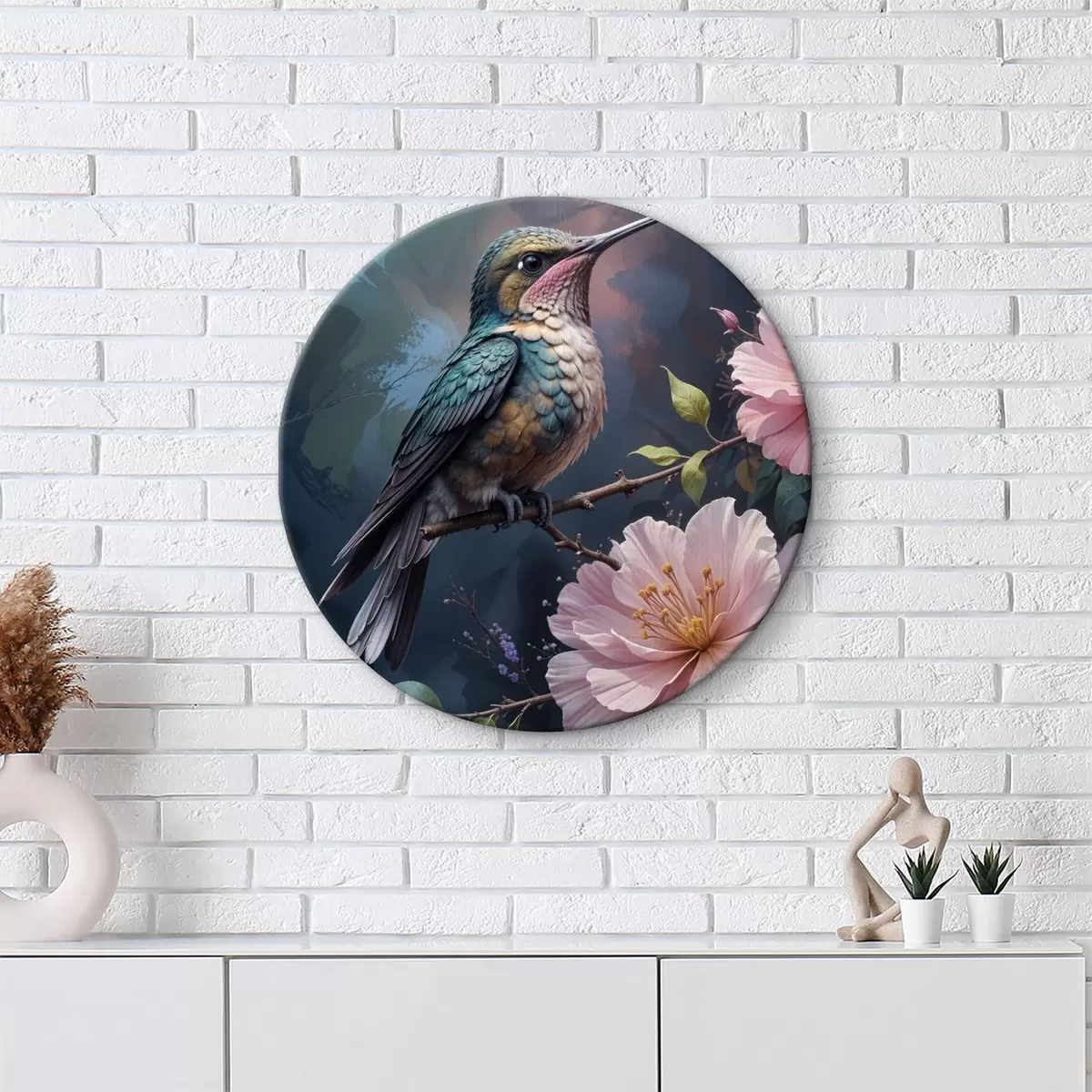 Obrázok Farebný kolibrík sediaci na konári so žiarivými ružovými kvetmi v pozadí Nr r40155