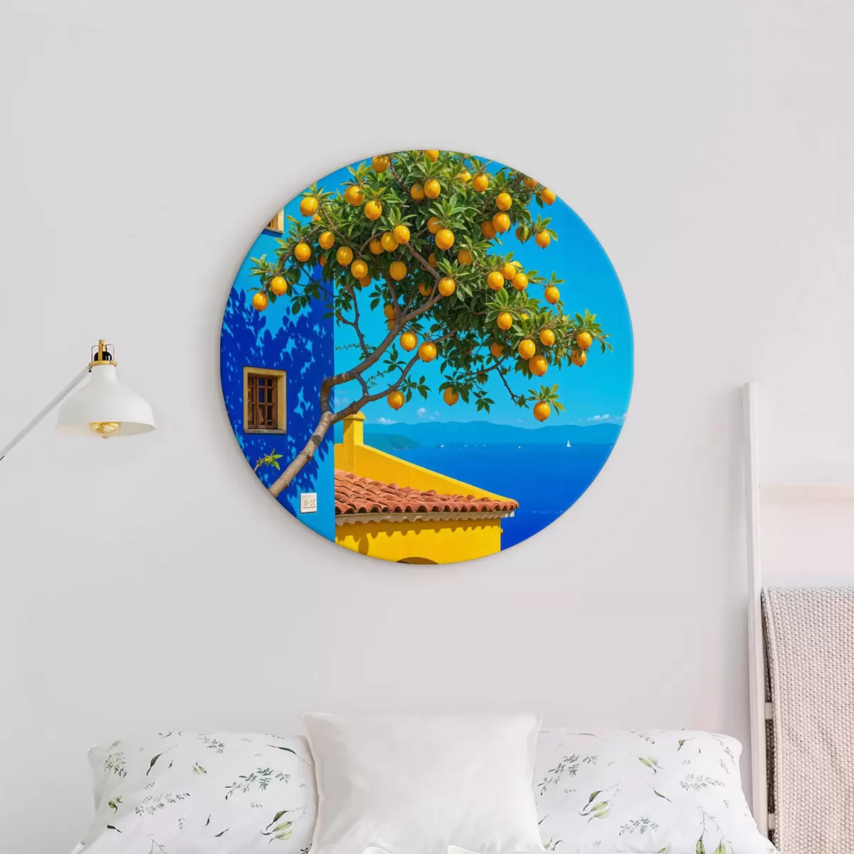 Obrázok Pomarančovník so zrelým ovocím, ktorý rastie na budove s modrou stenou a kachľovou strechou s výhľadom na oceán Nr r40159