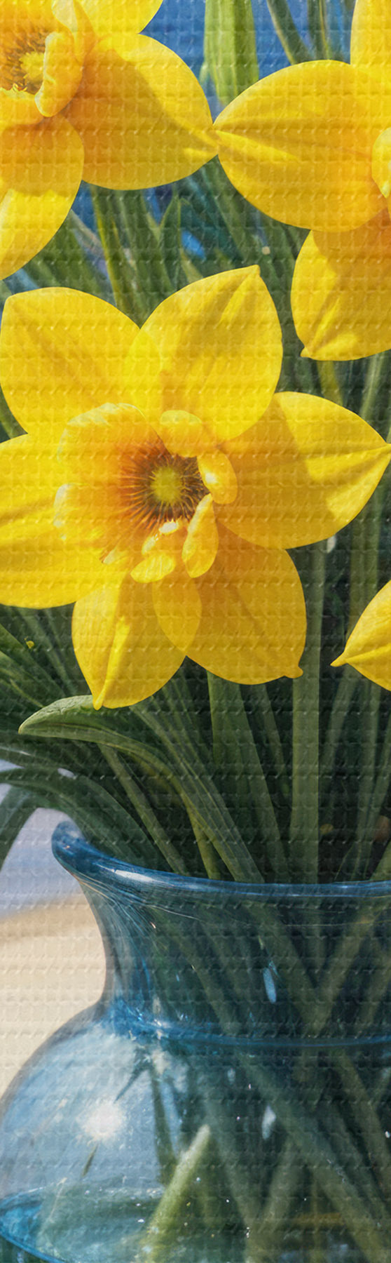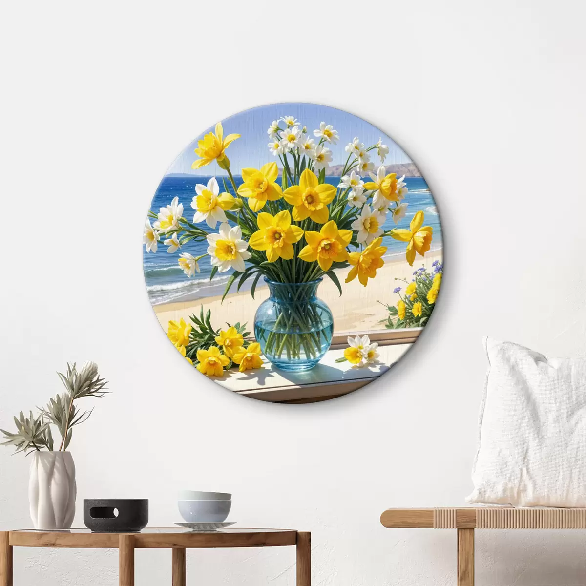 Obrázok Kytica žltých narcisov a bielych sedmokrások v sklenenej váze na parapete s výhľadom na pláž a oceán Nr r40171