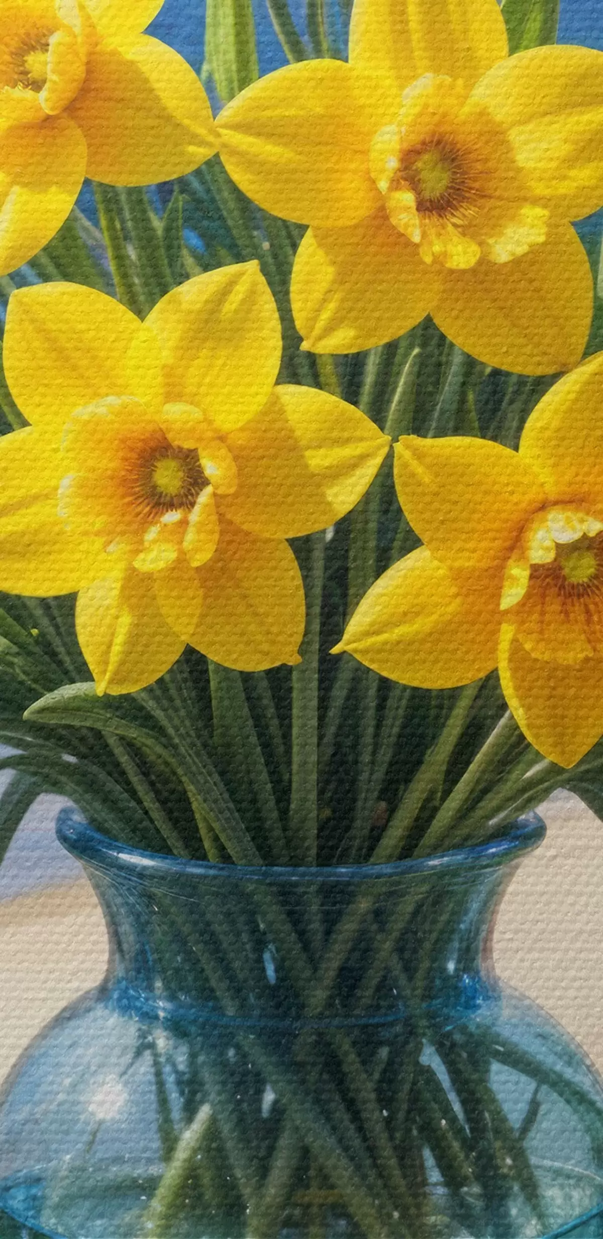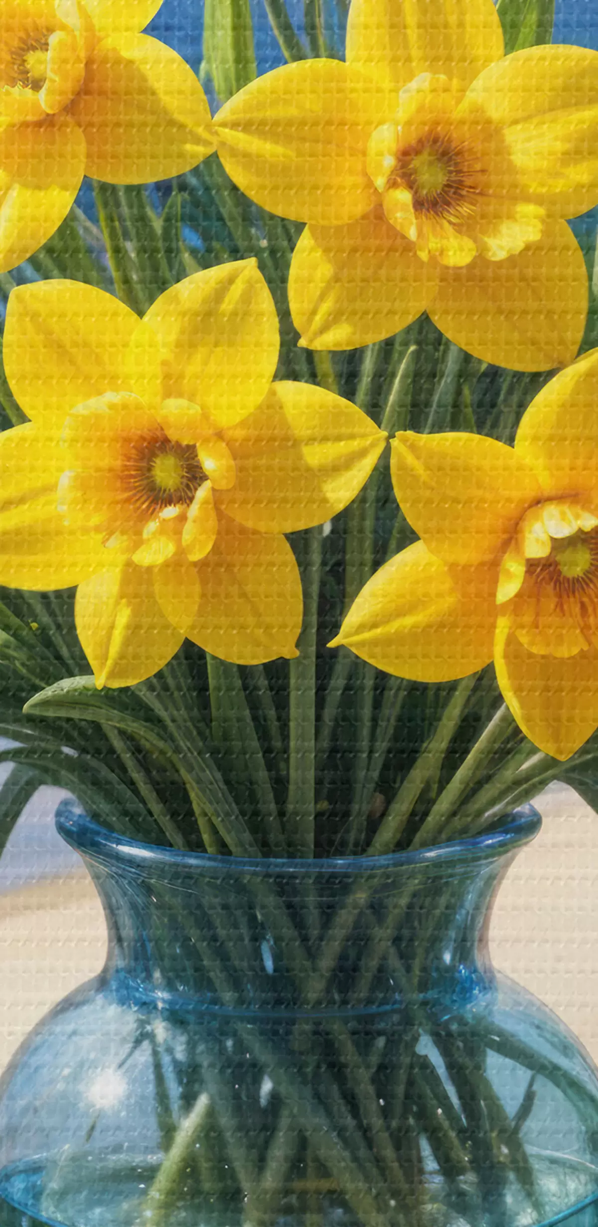Obrázok Kytica žltých narcisov a bielych sedmokrások v sklenenej váze na parapete s výhľadom na pláž a oceán Nr r40171