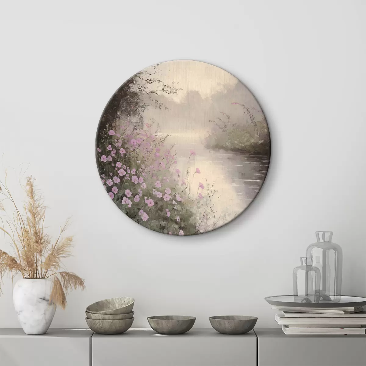 Obrázok Jazero s ružovými kvetmi, východ slnka, kresba olejom, pastelové béžové farby, hmla Nr r40229