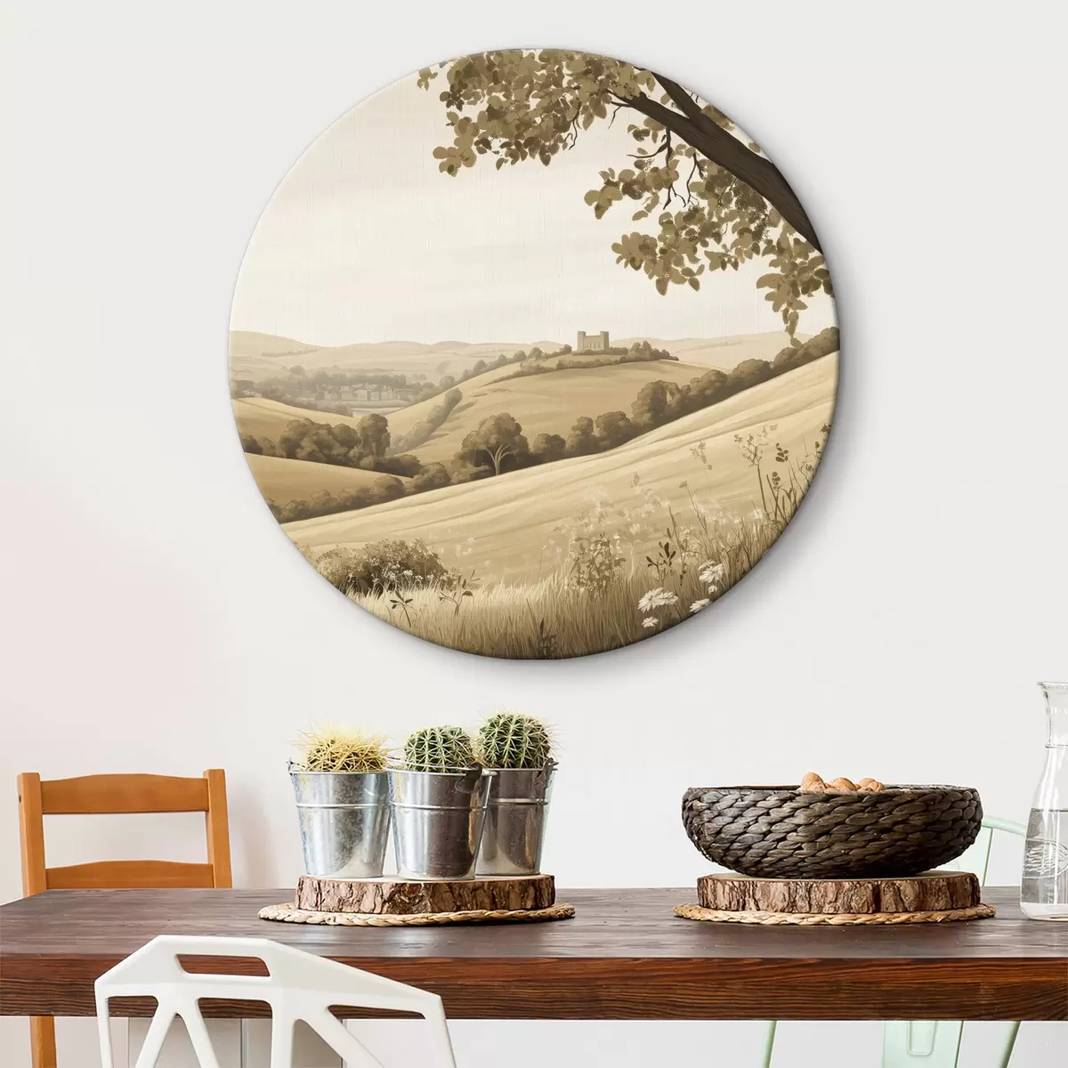 Obrázok Prírodná krajina v béžovej farebnej palete, lúka, kvety, stromy, hrad Nr r40230