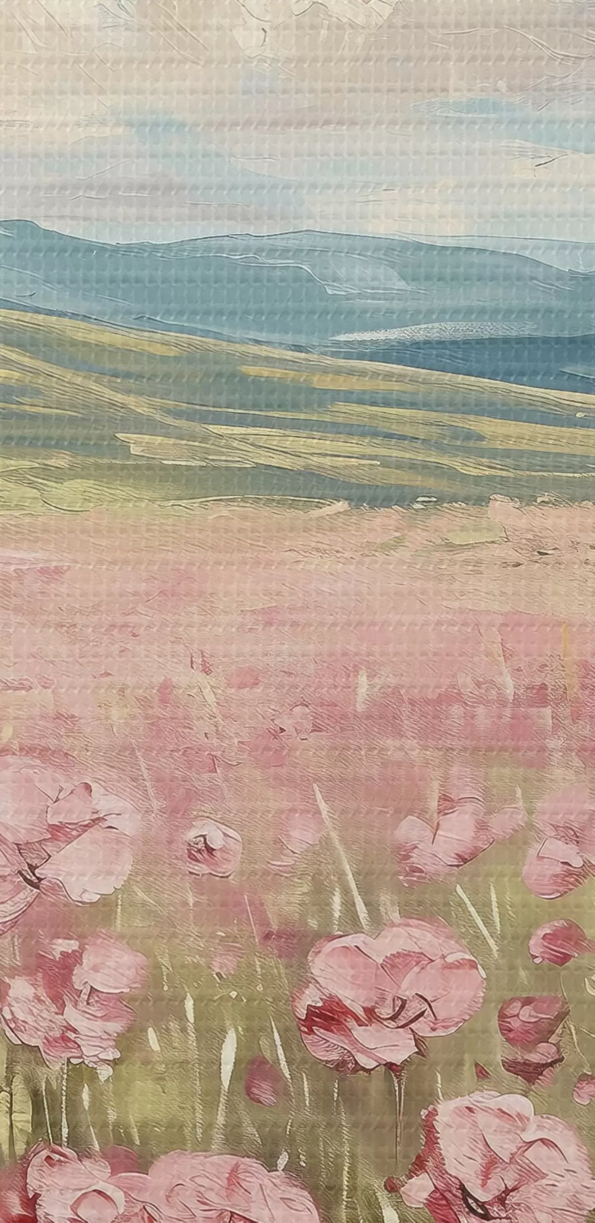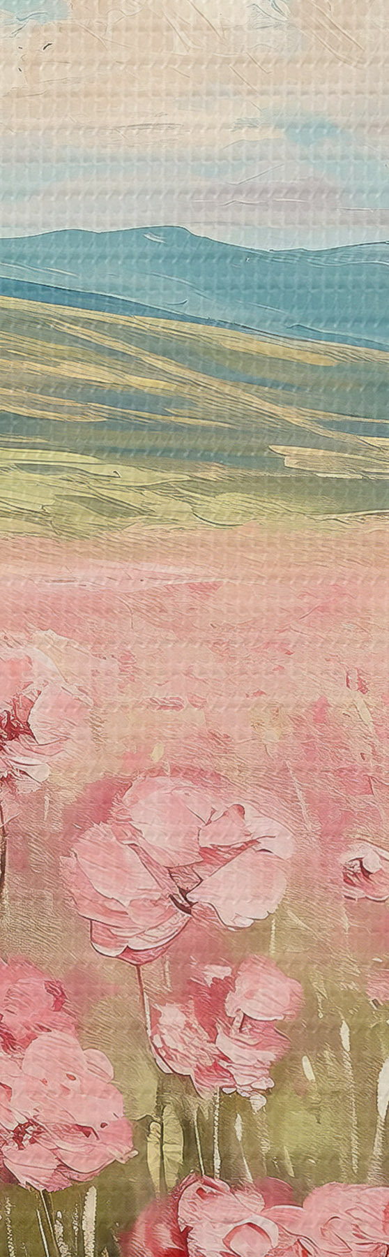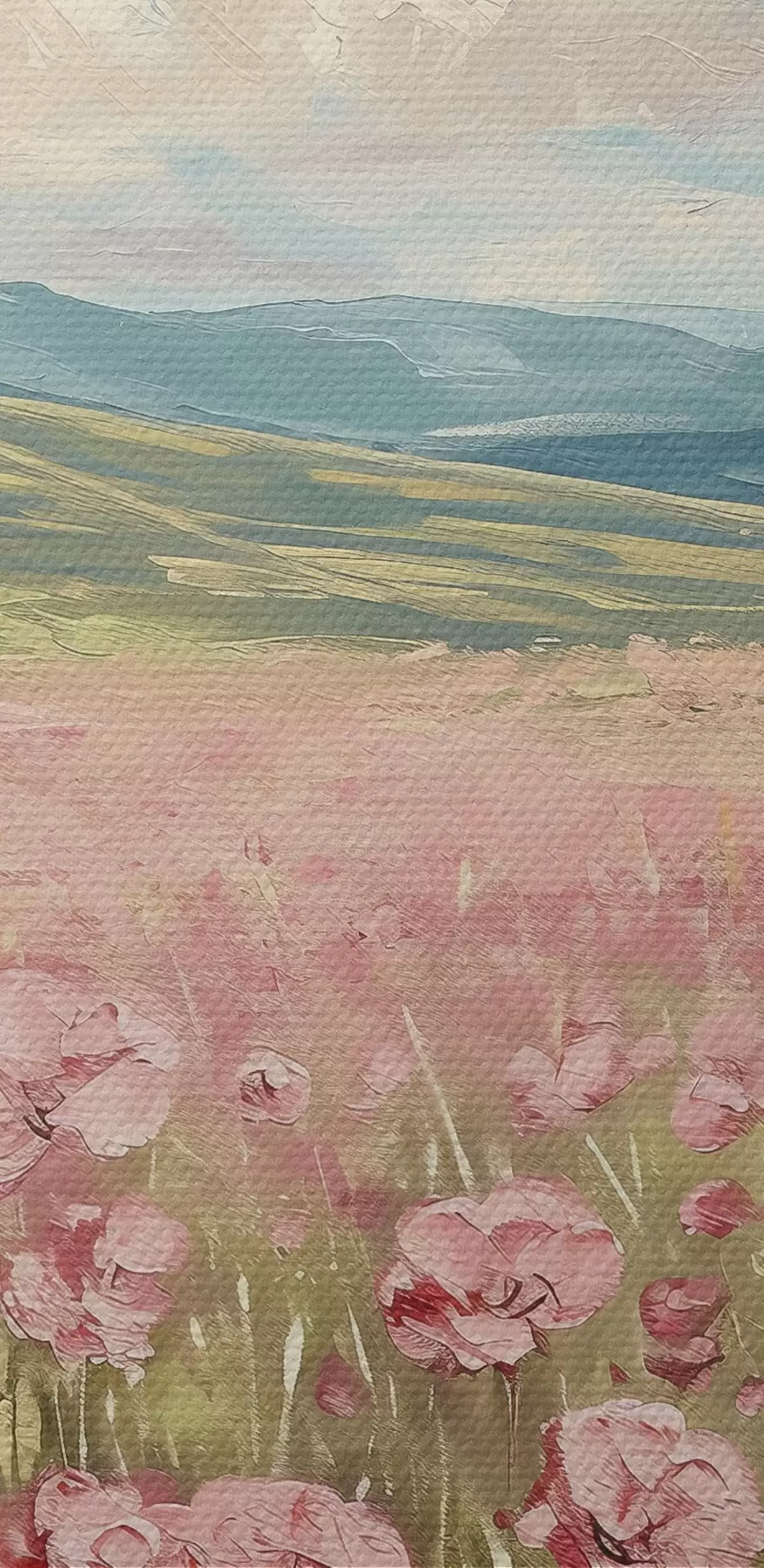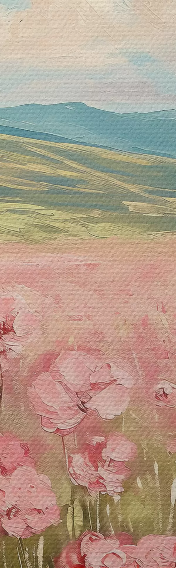 Obrázok Lúka s ružovými kvetmi, hory, prírodná krajina, modrá obloha s oblakmi, akryl Nr r40232