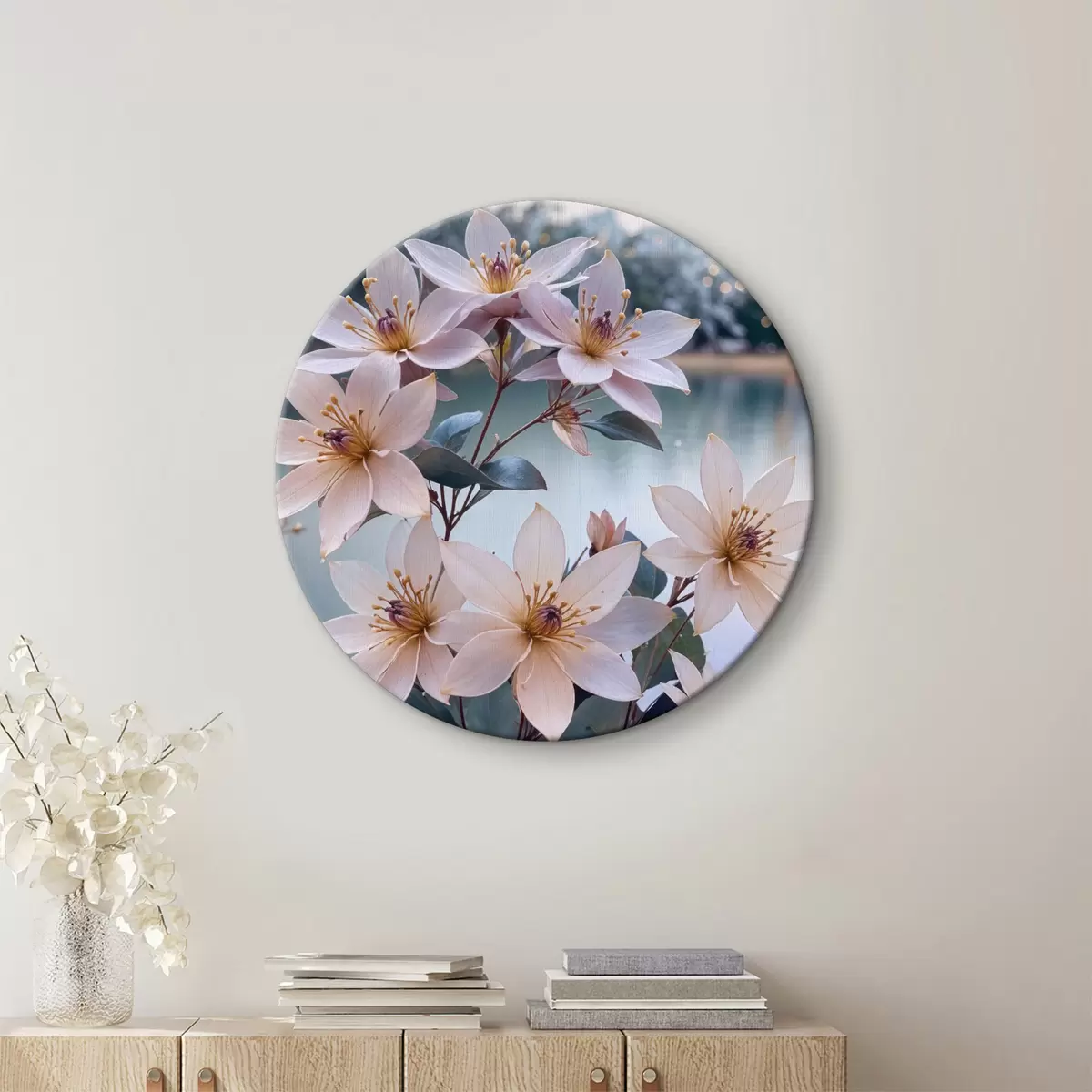 Obrázok Jemné ružové lotosové kvety plávajúce na pokojnej vode s rozmazaným pozadím stromov a lístia Nr r40388