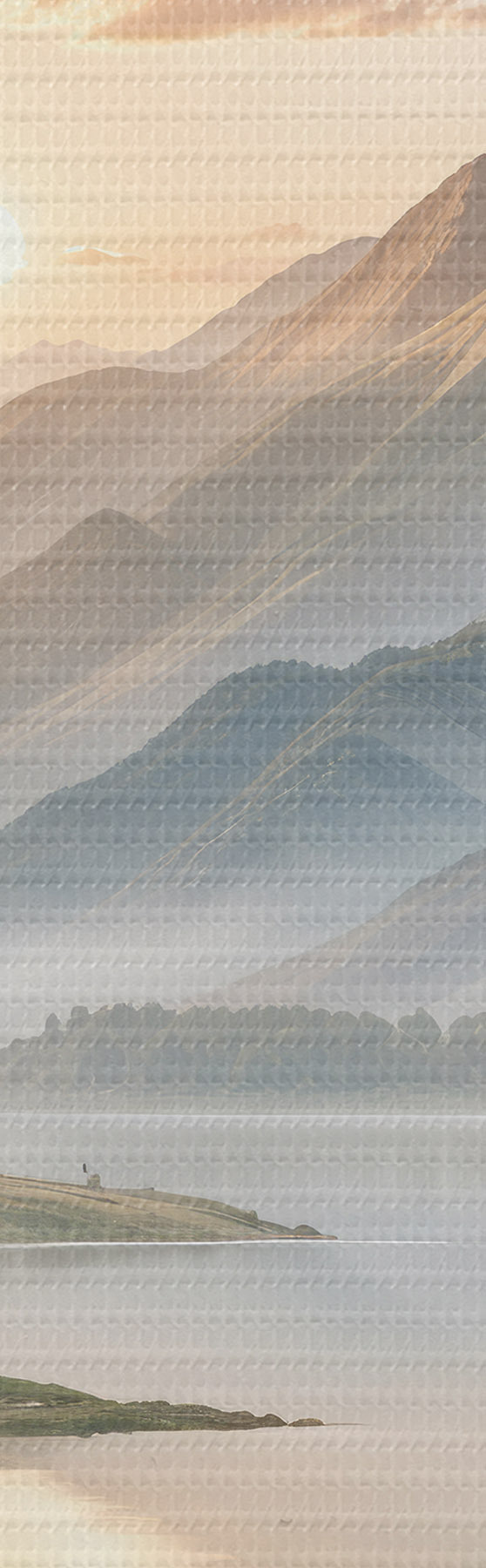 Obrázok Pokojná krajina s jazerom odrážajúcim hory v pozadí s malým člnom na pokojnej vode Nr r40391
