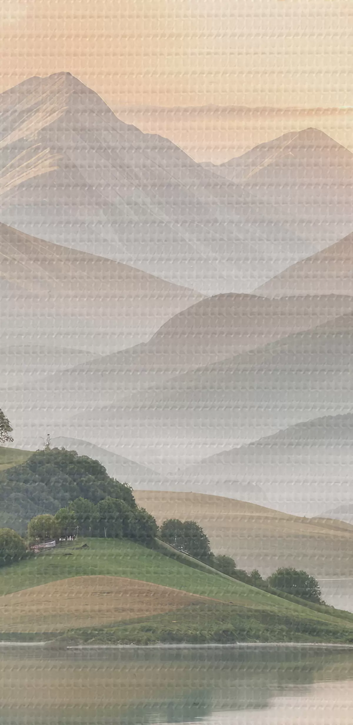 Obrázok Pokojná krajina s jazerom odrážajúcim hory v pozadí s malým člnom na pokojnej vode Nr r40391