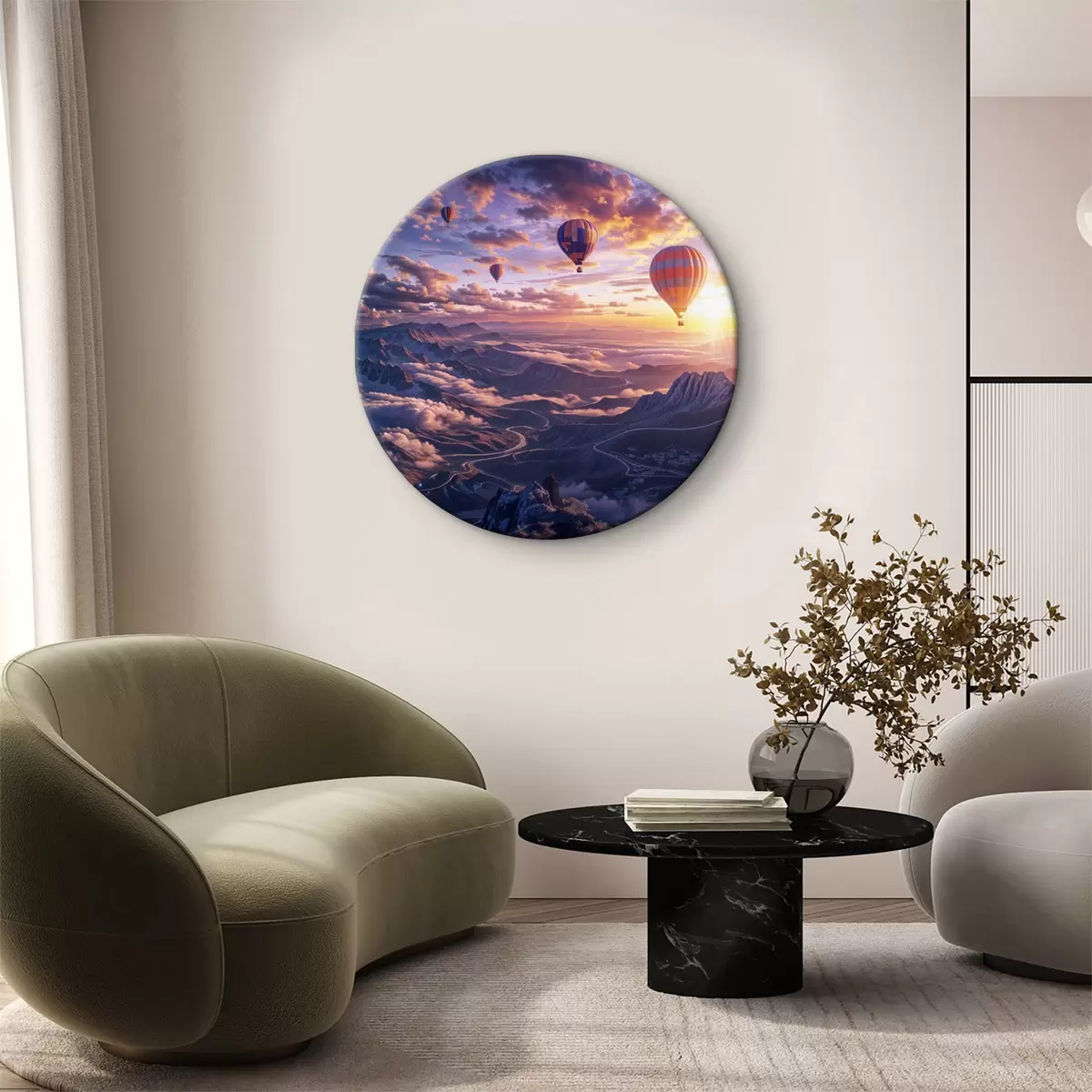 Obrázok Teplovzdušné balóny plávajúce nad hornatou krajinou pri západe slnka, s mrakmi a žiarivými farbami na oblohe Nr r40397