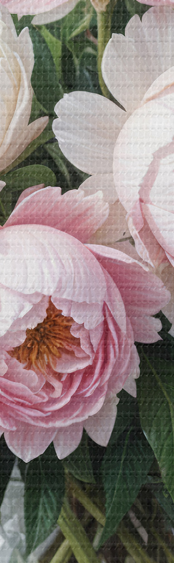 Obrázok Kytica krásnych ružovo-bielych pivónií v sklenenej váze, naaranžovaná na drevenom povrchu Nr r40398