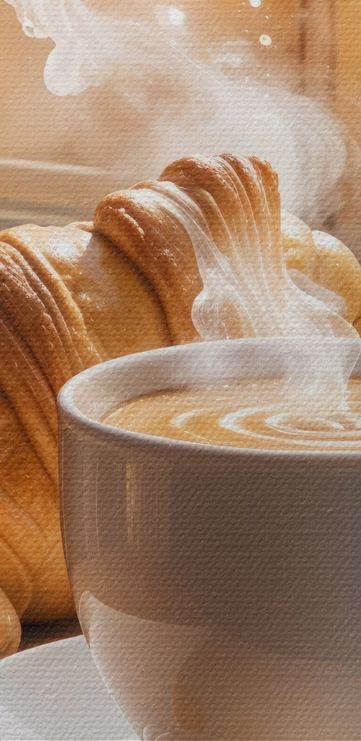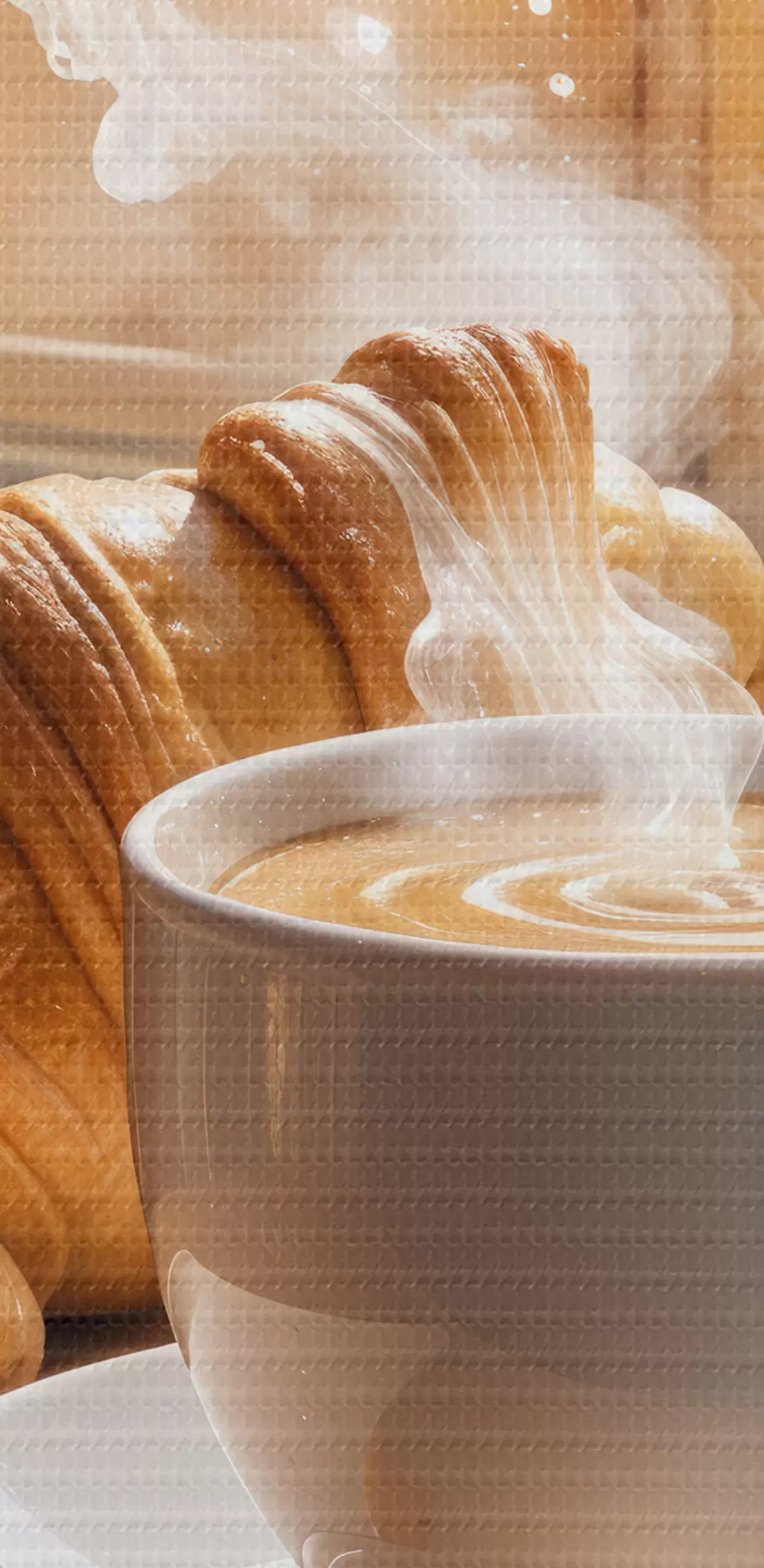 Obrázok Teplá šálka kávy so stúpajúcou parou, položená na stole vedľa croissantu, s výhľadom na historickú budovu Nr r40405