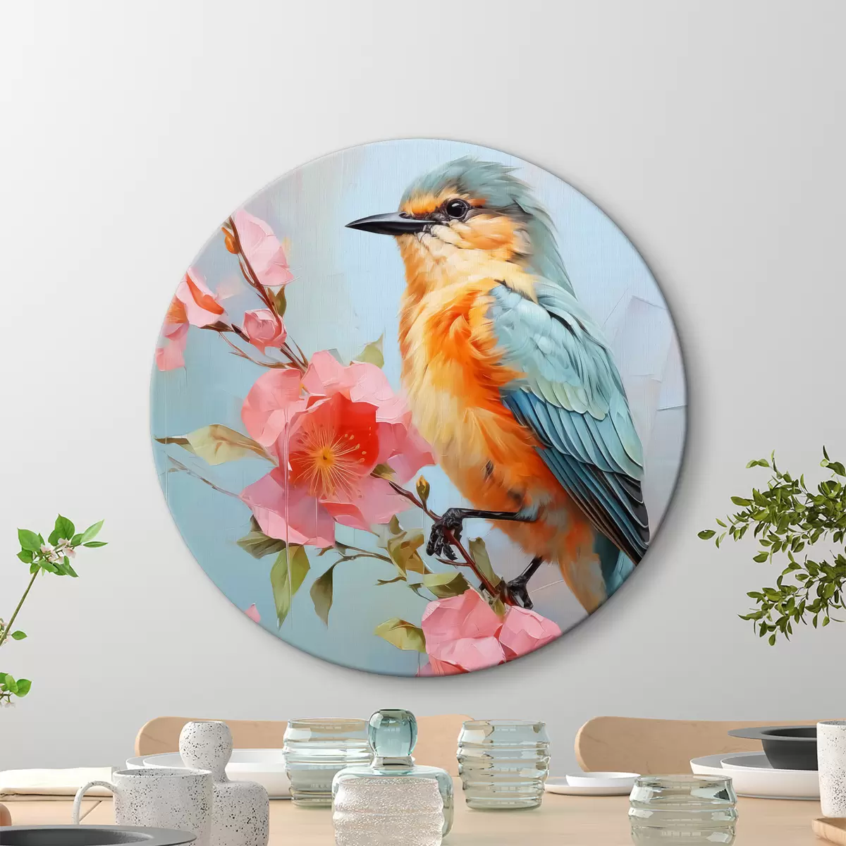 Obrázok Vták sediaci na konári s rozkvitnutými kvetmi, modrá, ružová, červená, oranžová, žltá farba Nr r40489