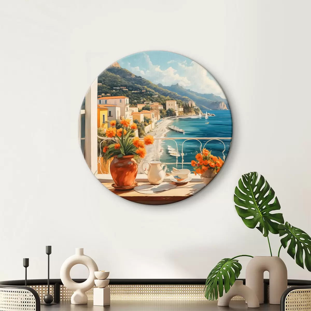 Obrázok Pohľad z balkóna na morskú lagúnu s horami v pozadí, svetlé kvety v kvetináči Nr r40492