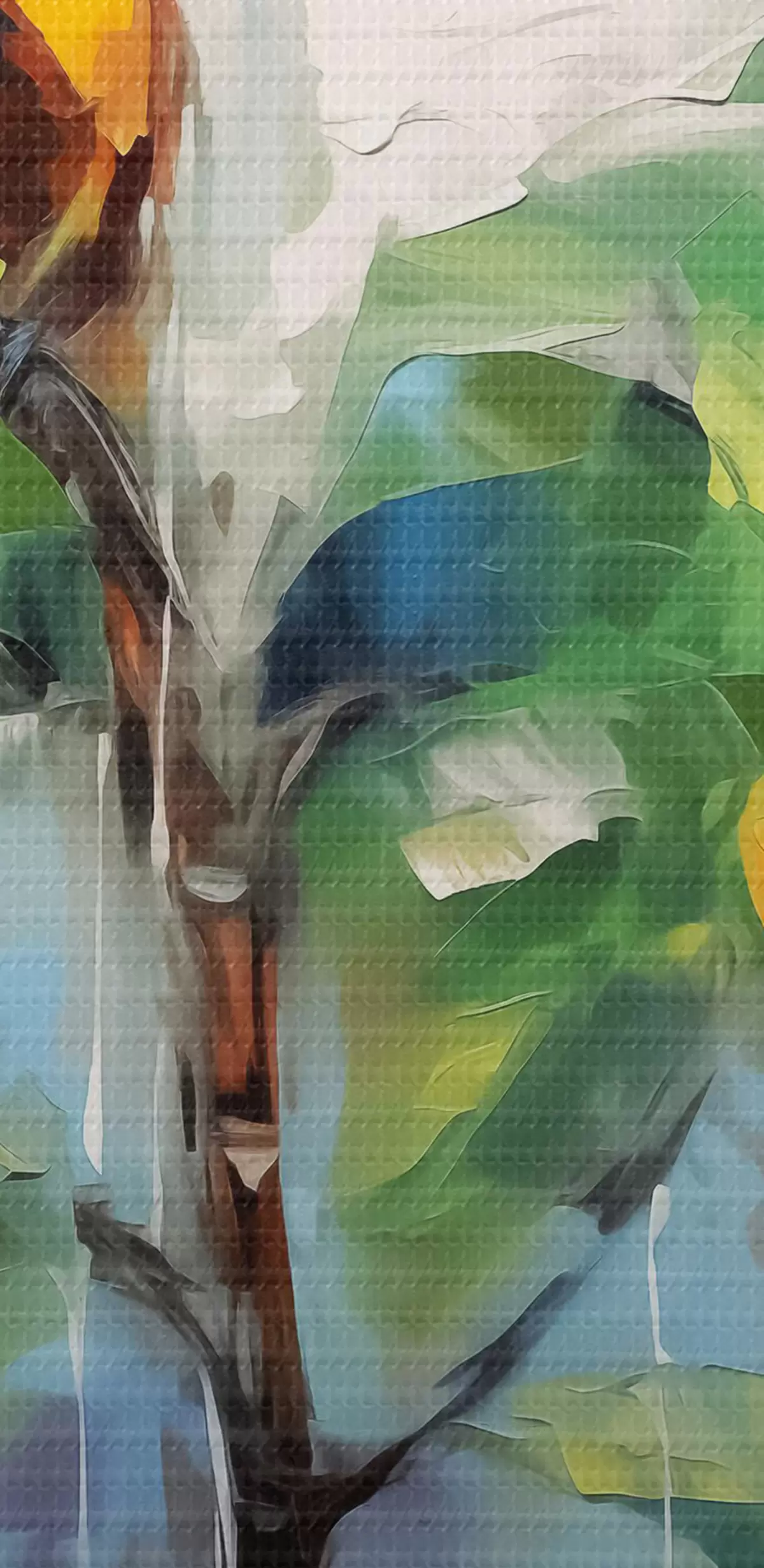 Obrázok Abstraktný tukan sediaci na banánovej palme, zelená, modrá, sivá, žltá, červená farba Nr r40518
