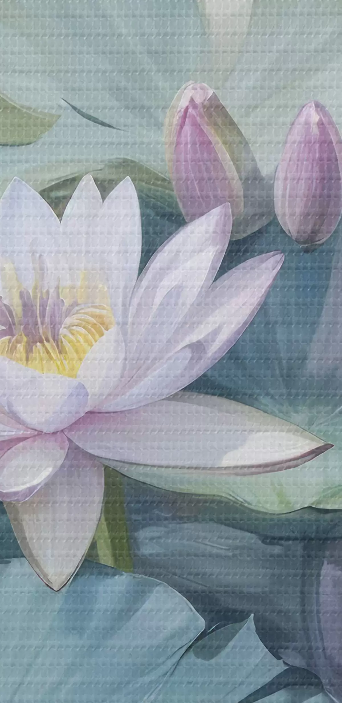 Obrázok Pokojný obraz rybníka s leknami a kvetmi v pastelových farbách, obklopený sviežimi zelenými listami lekna Nr r40542