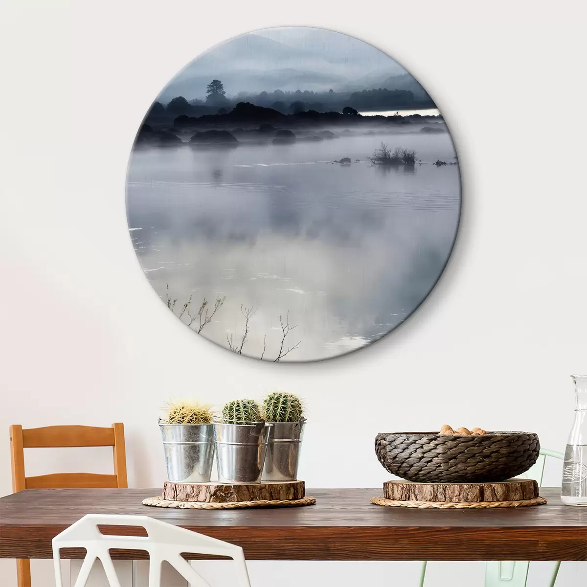 Obrázok Hmlisté jazero obklopené siluetami kopcov a stromov v pozadí, s pokojnou, odrážajúcou sa hladinou Nr r40552