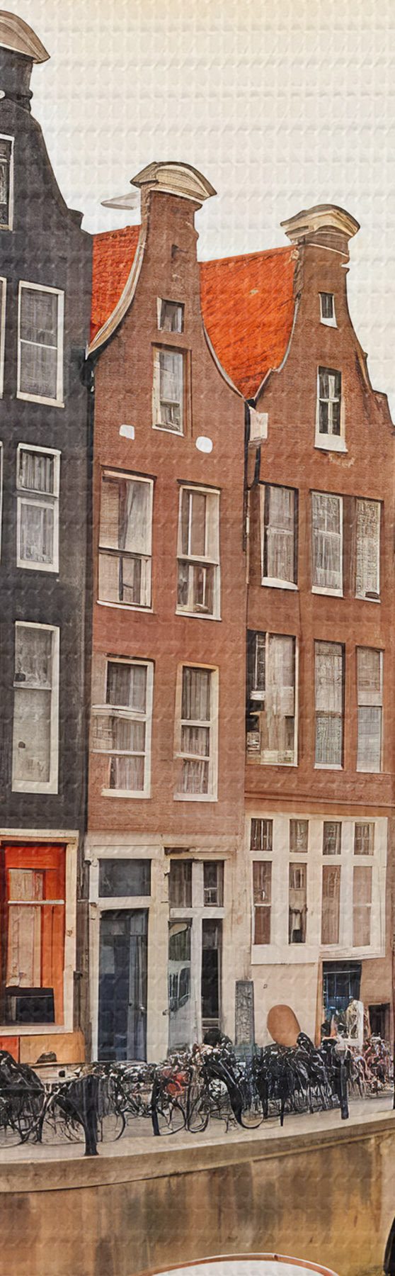 Obrázok Farebná akvarelová mestská krajina Amsterdamu s tradičnými holandskými domami na kanáli a loďami na vode Nr r40561
