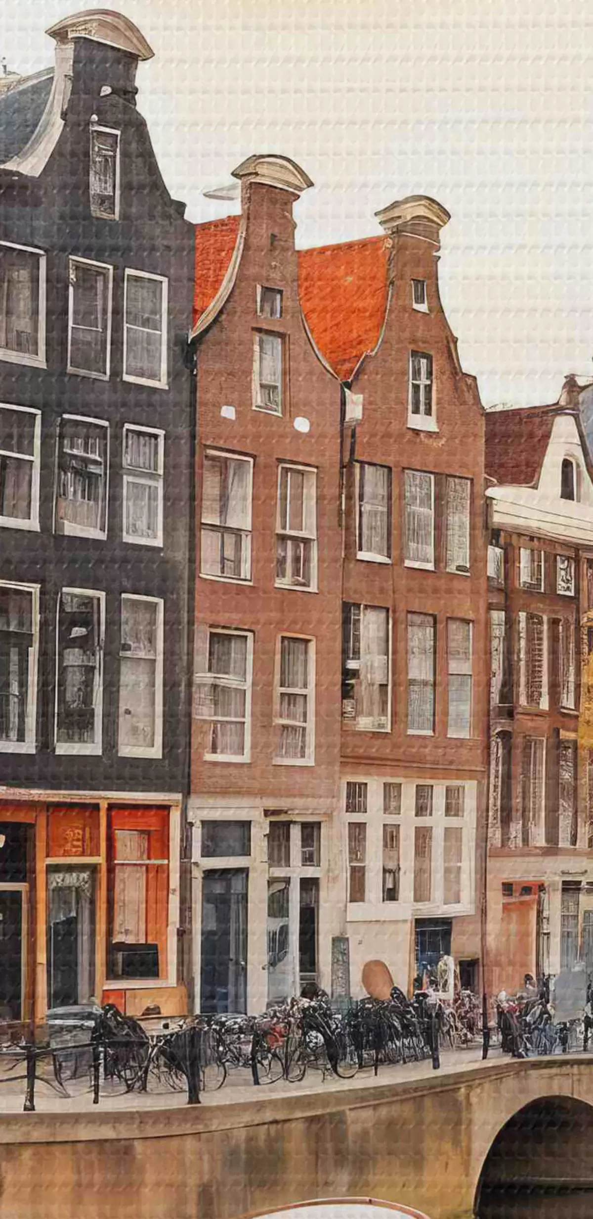 Obrázok Farebná akvarelová mestská krajina Amsterdamu s tradičnými holandskými domami na kanáli a loďami na vode Nr r40561