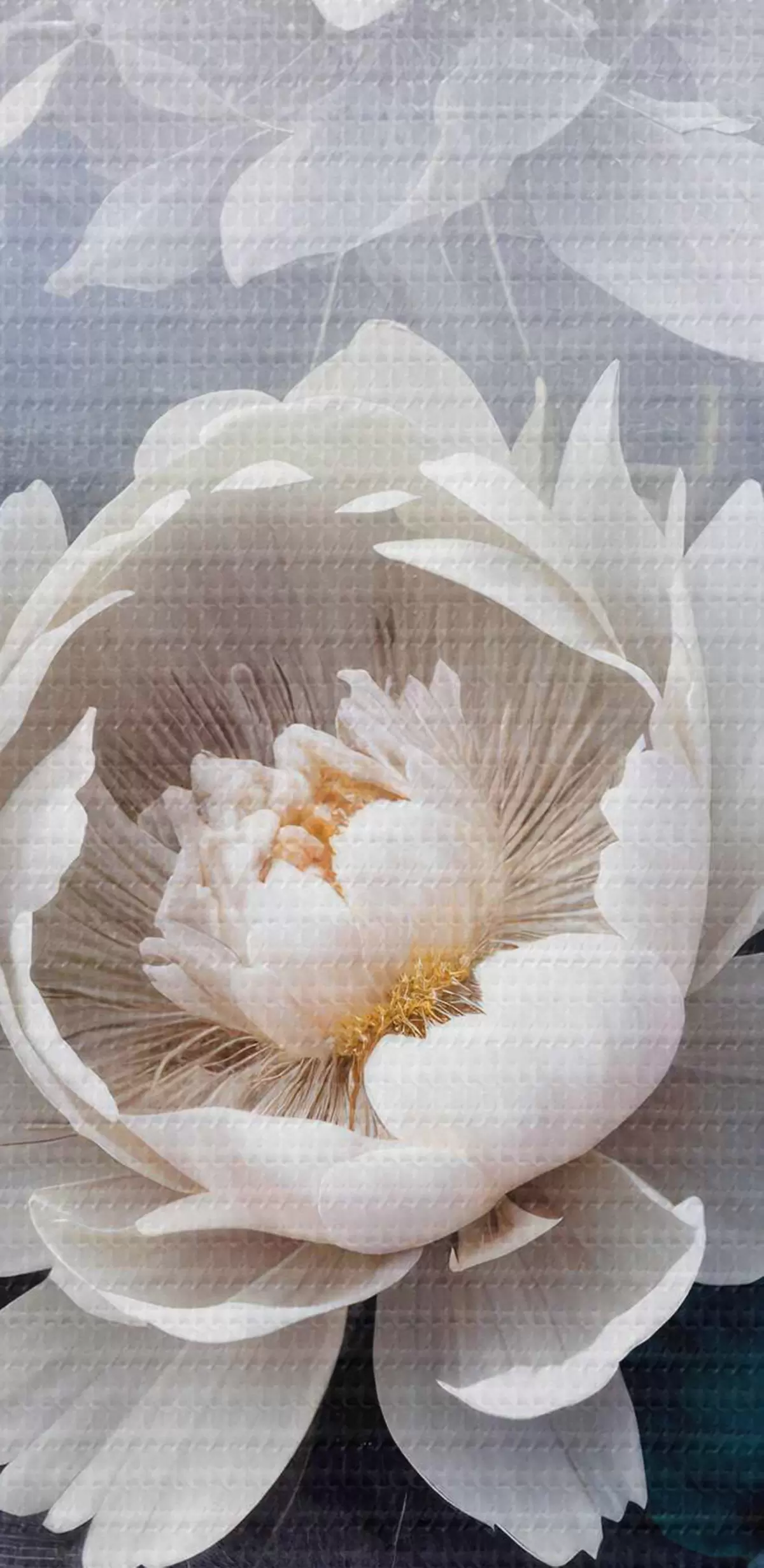 Obrázok Biele kvety pivonky so zelenými listami na modrom textúrovanom pozadí Nr r40569