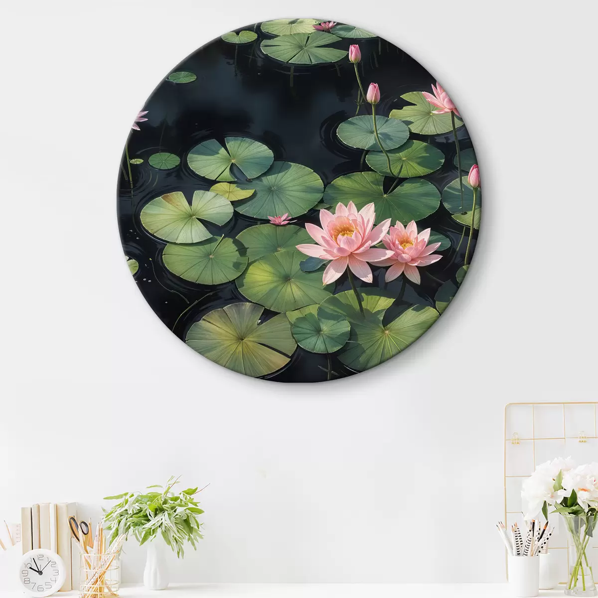 Obrázok Rybník s ružovými leknami a zelenými okvetnými lístkami ľalií plávajúcimi na hladine, obklopený tmavým pozadím Nr r40598
