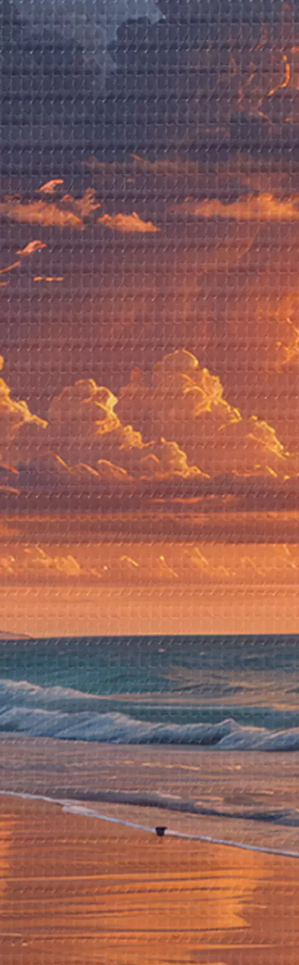 Obrázok Dramatický západ slnka nad tropickou plážou so žiarivými oranžovými a ružovými mrakmi odrážajúcimi sa v pokojnej vode Nr r40599