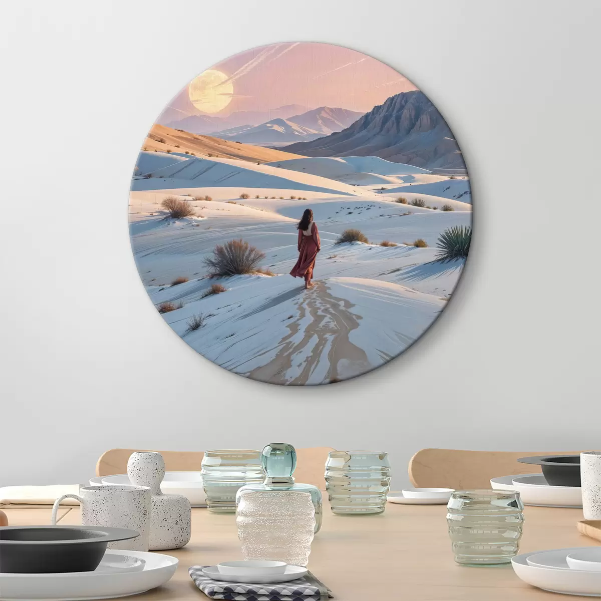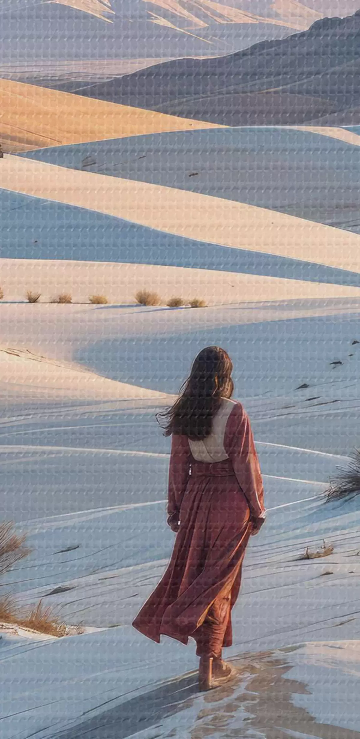 Obrázok Žena v červených šatách v púštnej krajine s horou v pozadí a dunami Nr r40603