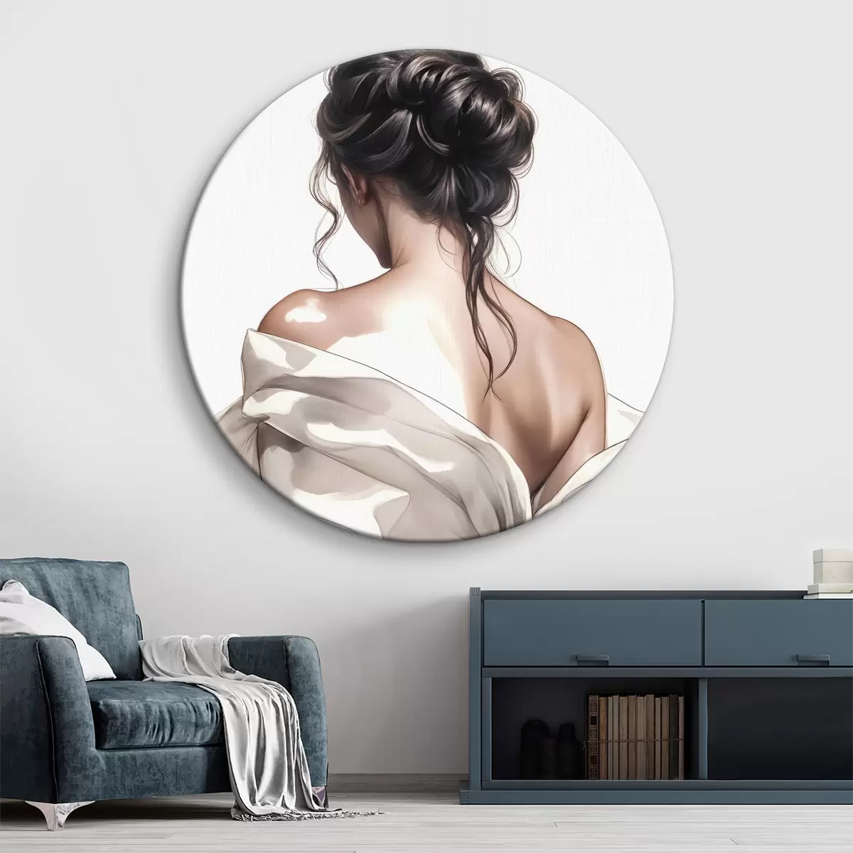 Obrázok Minimalistická maľba zobrazujúca ženu s dlhými tmavými vlnitými vlasmi upravenými do elegantného účesu, ktorá má na sebe biely župan Nr r40605