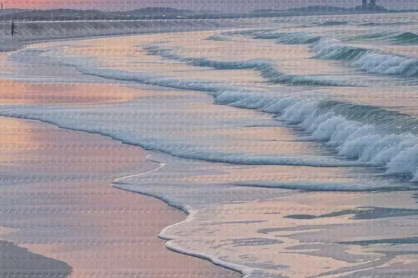 Obrázok Pokojná scéna na pláži pri západe slnka s jemnými vlnami narážajúcimi na piesočnaté pobrežie Nr r40606