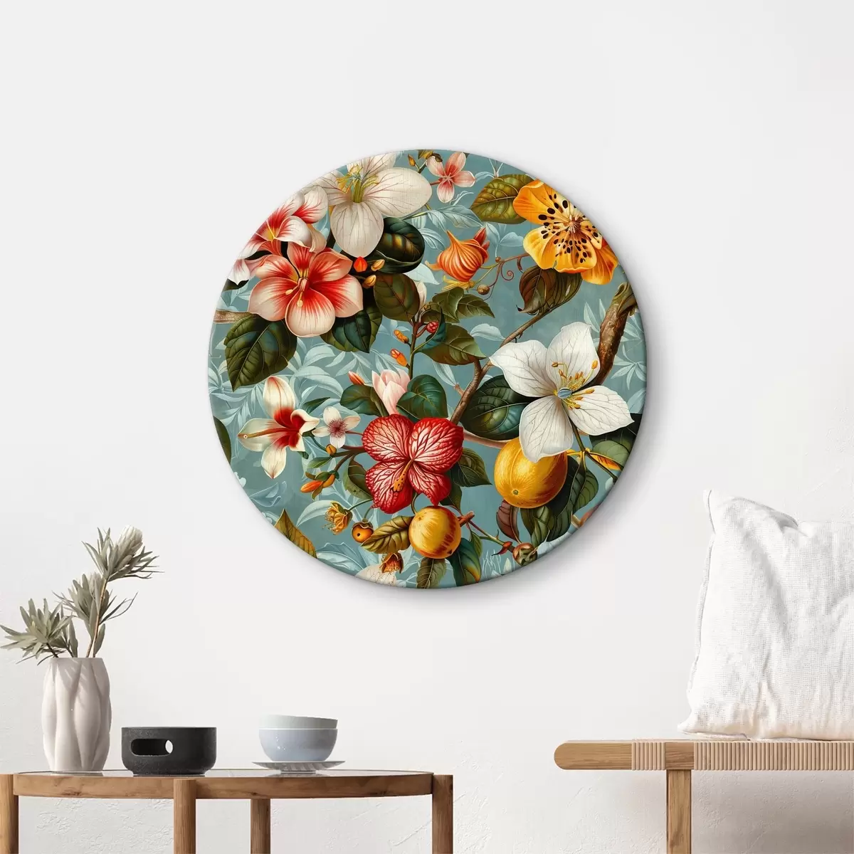 Obrázok Kompozícia s rôznou zeleňou a tropickými kvetmi na modrom pozadí Nr r40668