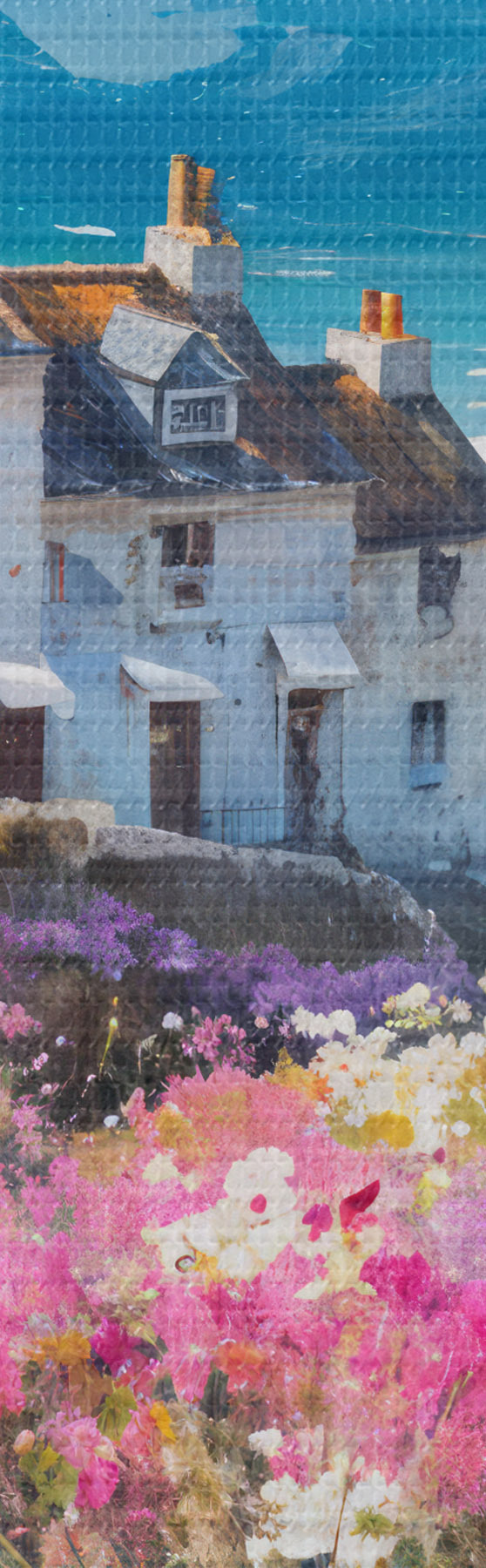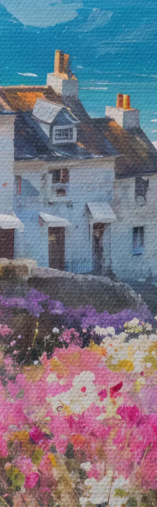 Obrázok Farebná olejomaľba zobrazujúca prímorské mesto s bielymi domami a živou kvetinovou záhradou v popredí Nr r41090