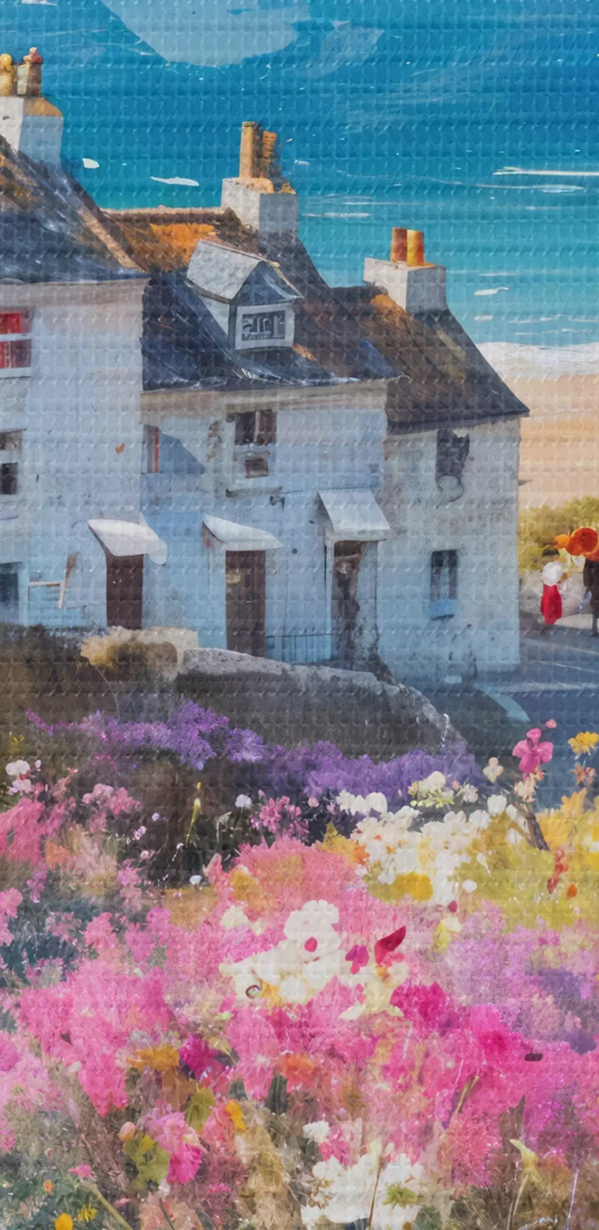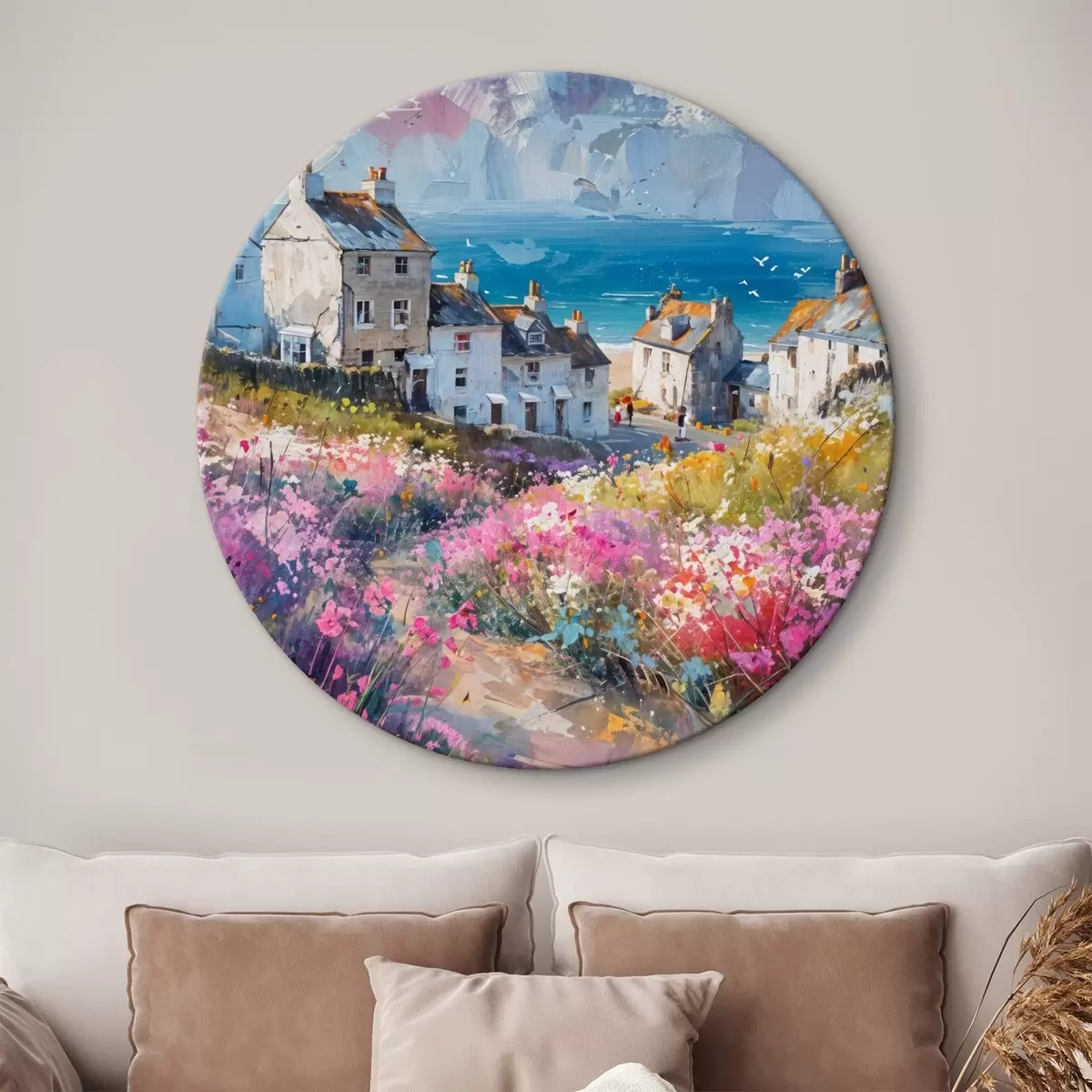 Obrázok Farebná olejomaľba zobrazujúca prímorské mesto s bielymi domami a živou kvetinovou záhradou v popredí Nr r41090