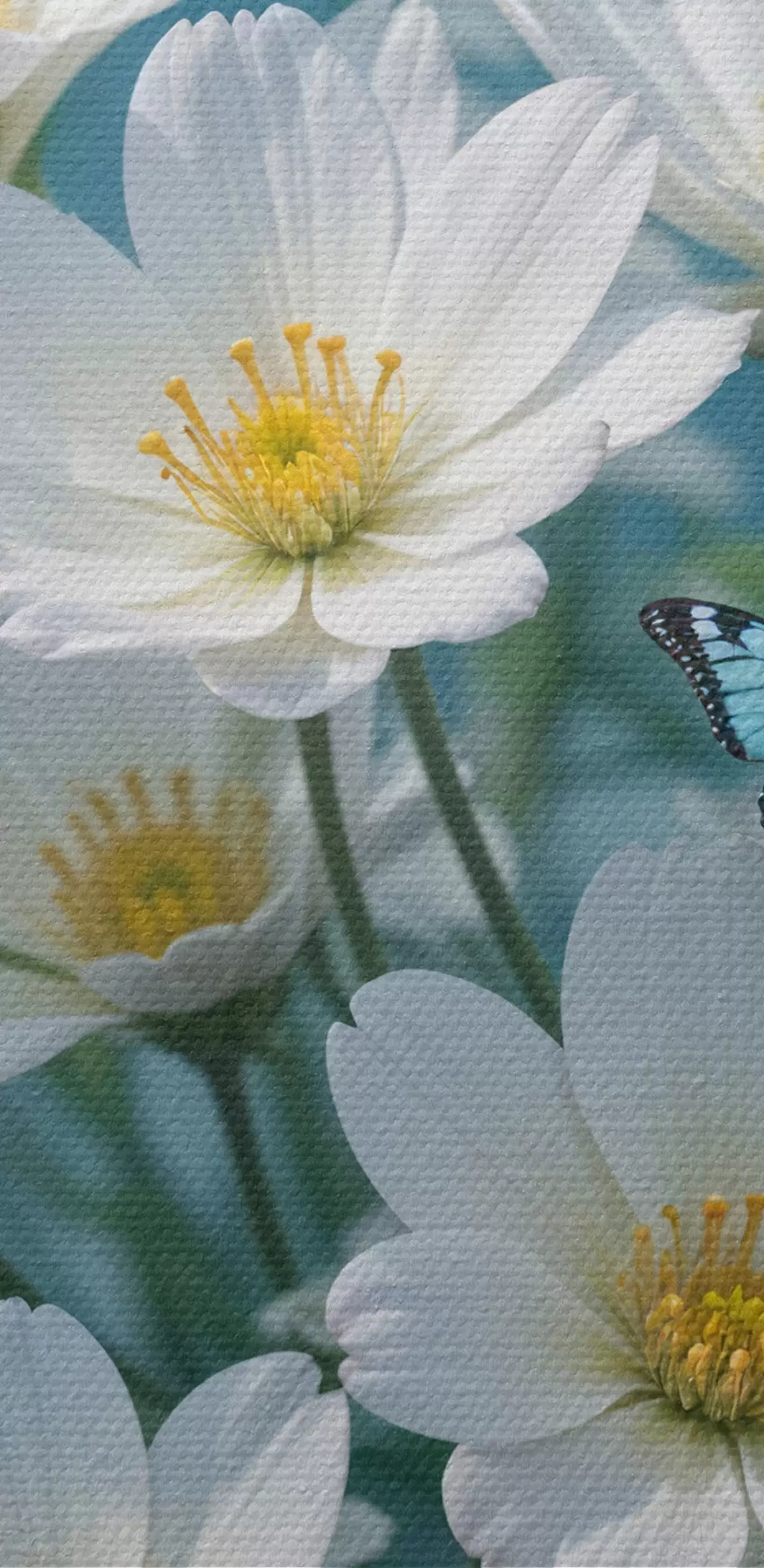 Obrázok Pole bielych kvetov sedmokrásky s modrými motýľmi poletujúcimi medzi nimi na rozmazanom modrom pozadí Nr r41096