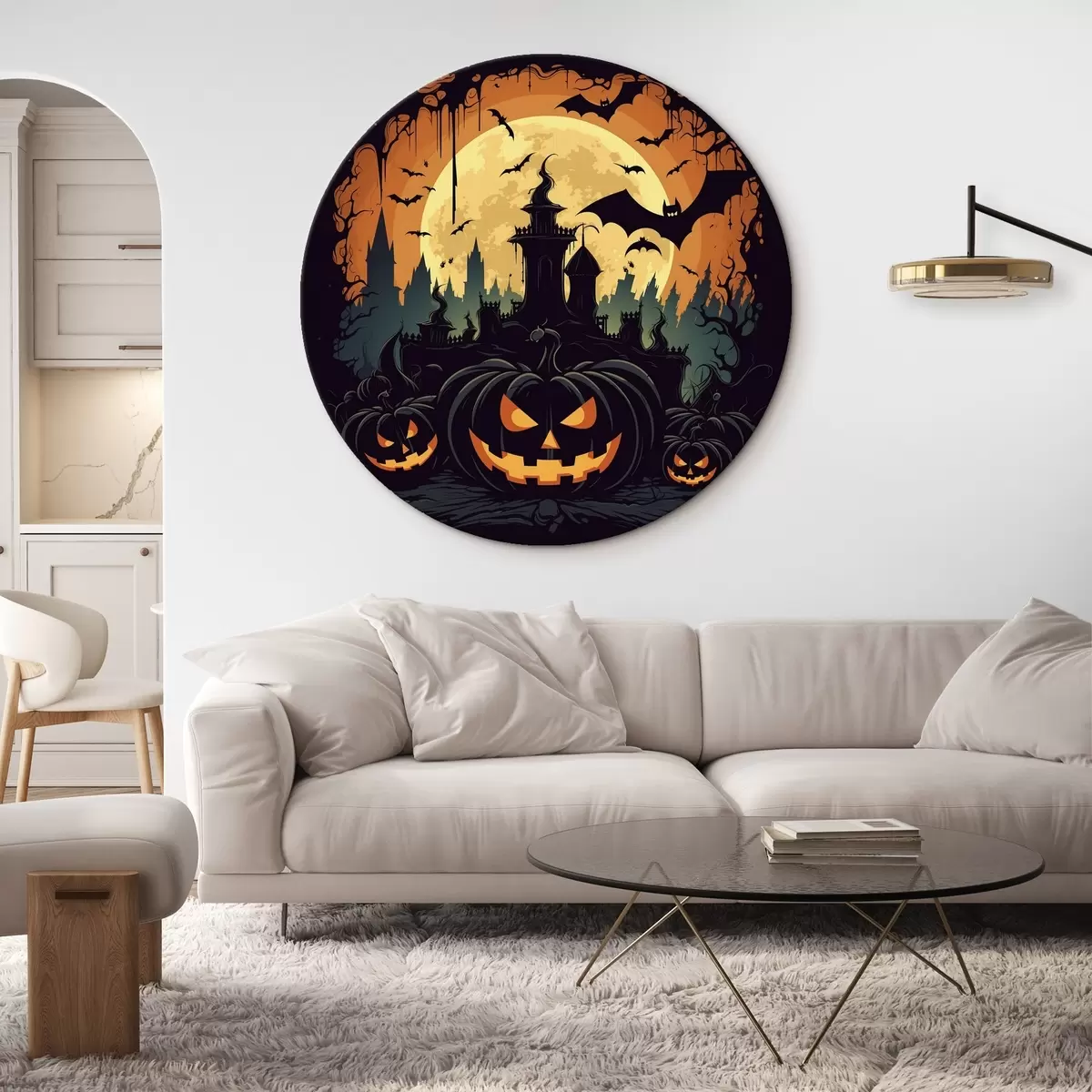Obrázok Halloween, hrad na pozadí mesiaca v splne, netopiere a tekvice Nr r41138