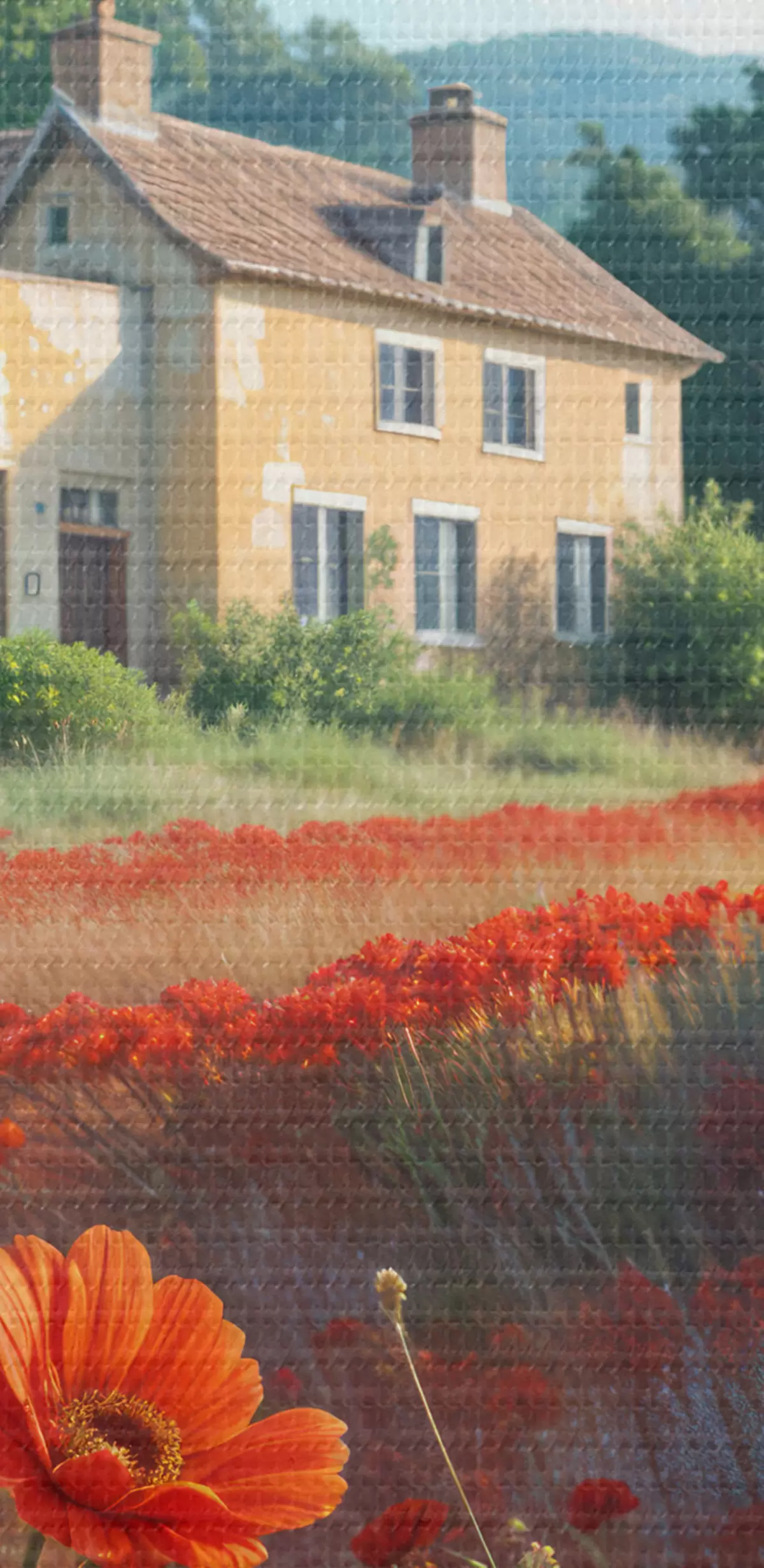 Obrázok Pole žiarivo červených makov v popredí s radom pôvabných žltých a bielych domčekov v pozadí Nr r41260