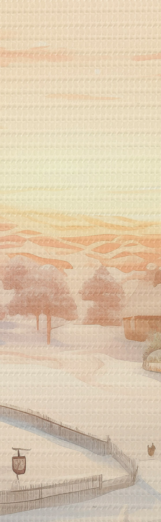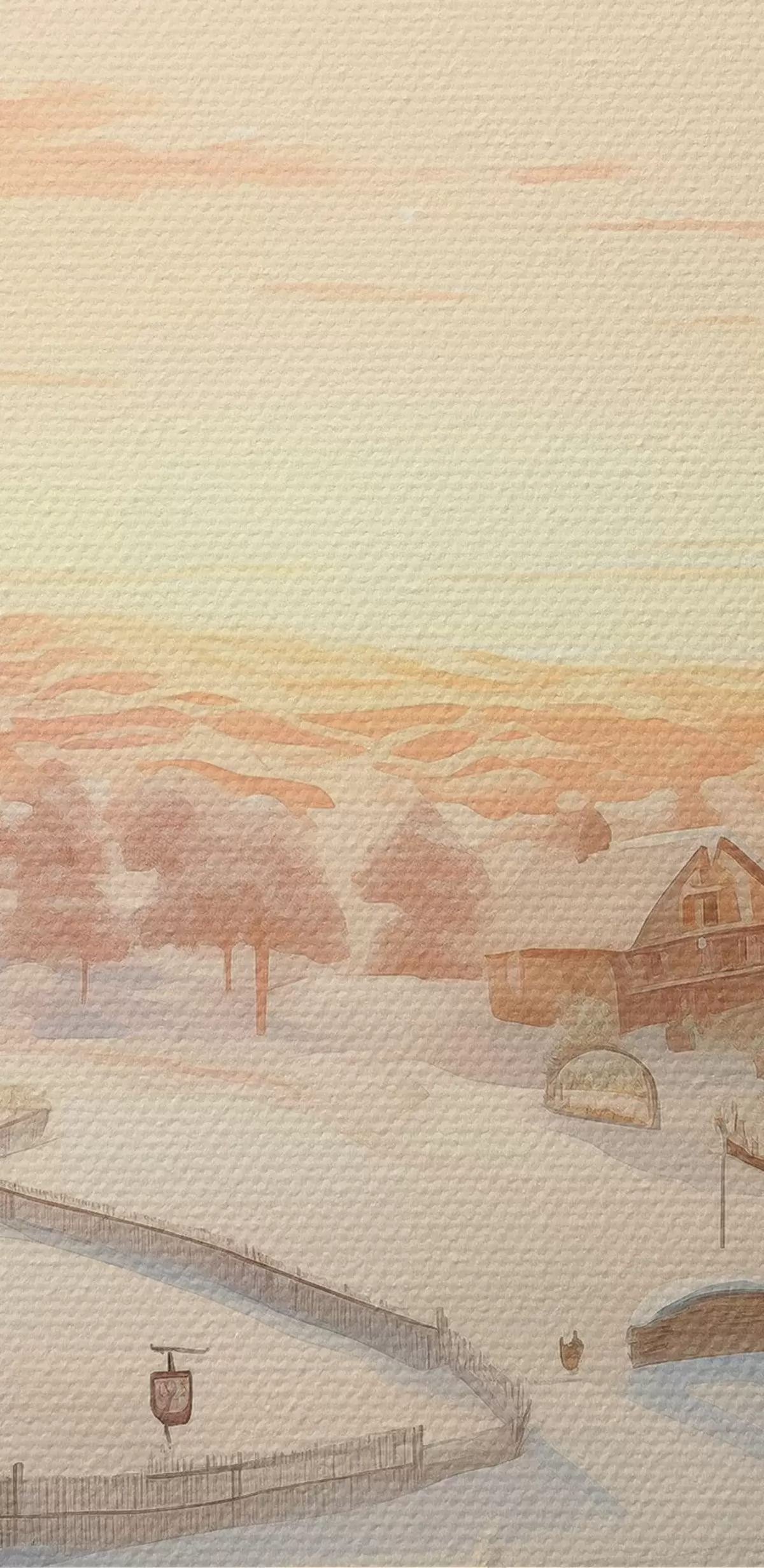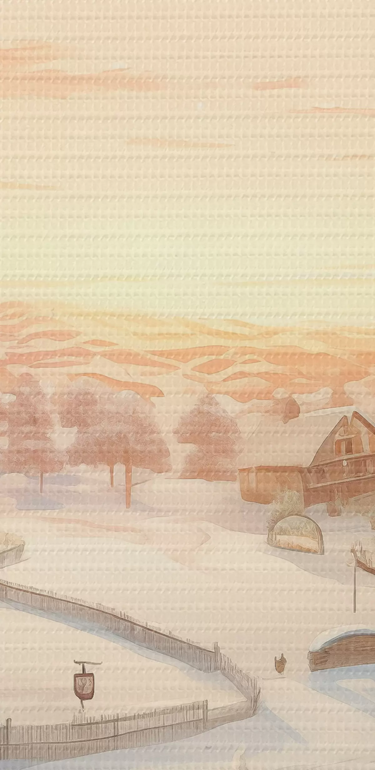 Obrázok Zimná dedina pri západe slnka, domy pokryté snehom, borovice Nr r41380
