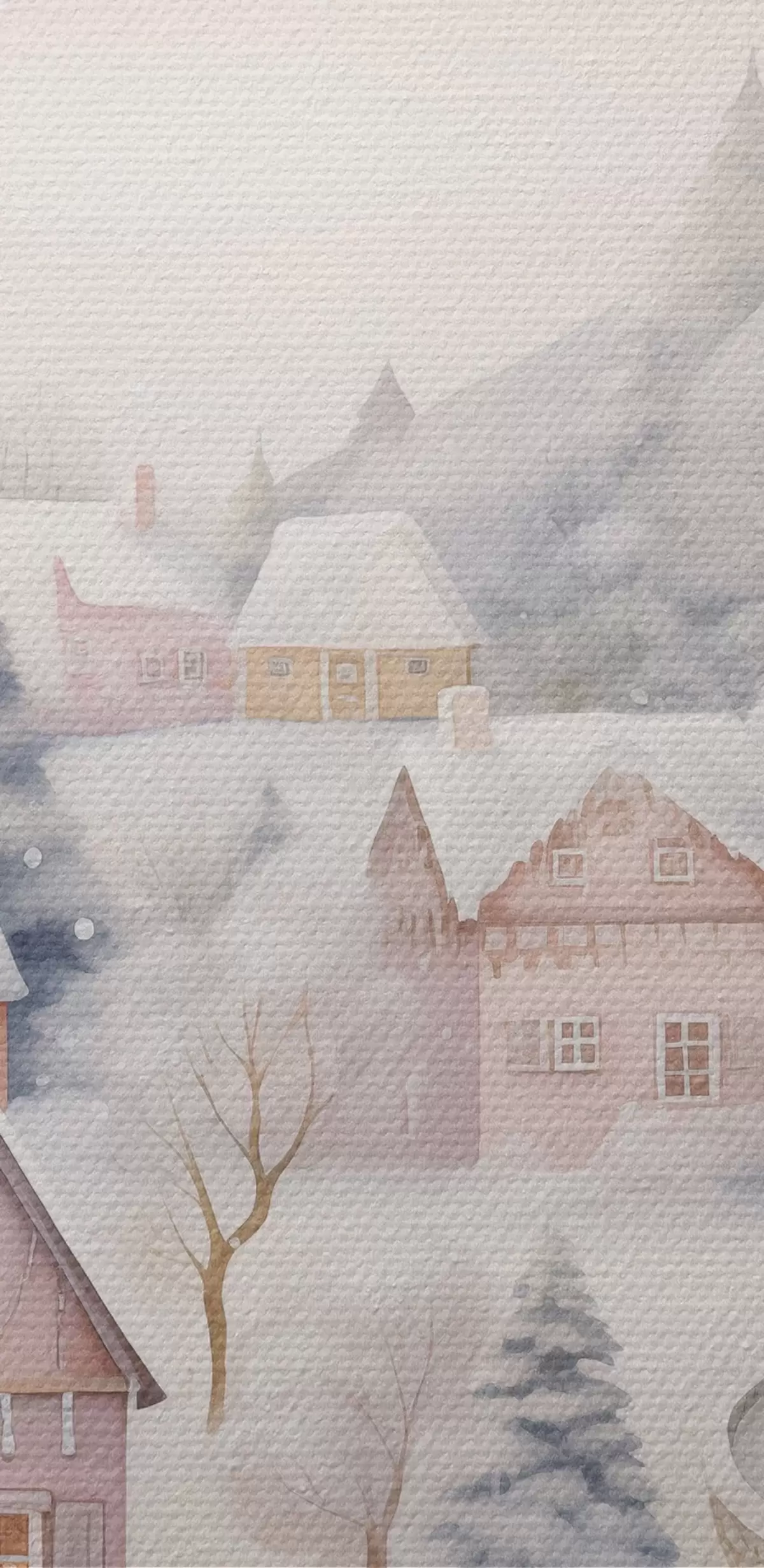Obrázok Akvarel zimná dedina, borovicový les, domy, hory, jemné pastelové farby Nr r41388