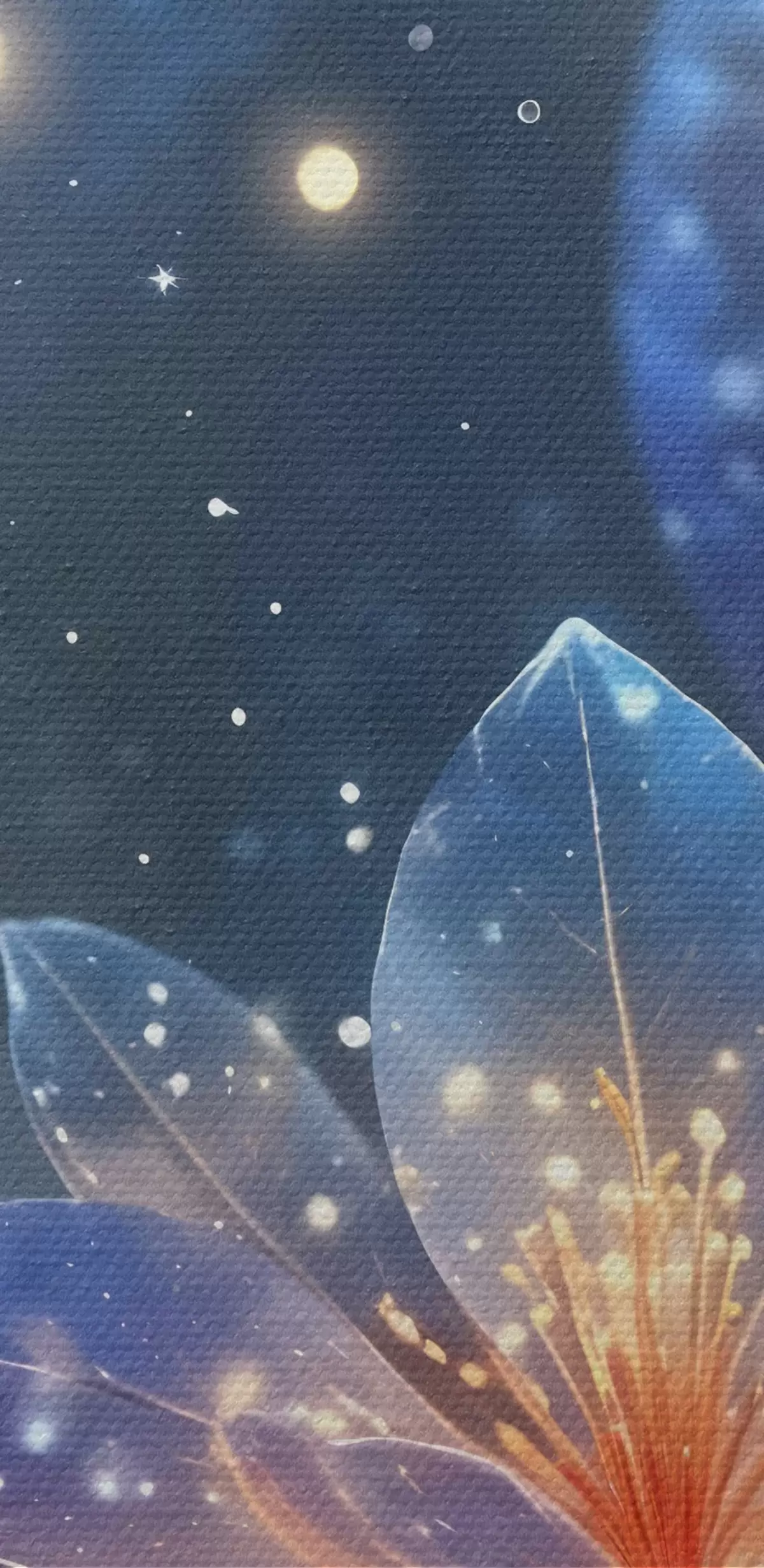 Obrázok Abstraktné fantasy kvety na konároch s textúrovanými okvetnými lístkami s hviezdami a mesiacom na pozadí nočnej oblohy Nr r42211